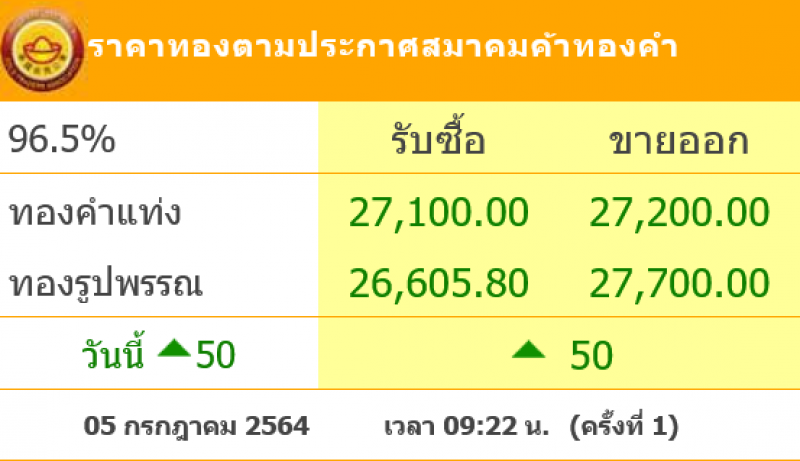 วันที่ 5 กรกฎาคม 2564 สมาคมค้าทองคำรายงาน ราคาทองไทย ครั้งที่ 1 เมื่อเวลา 09:22 น. โดยราคาทองล่าสุดราคานั้น ได้มีการปรับขึ้นมาอีก 50 บ. ส่งผลทำให้ราคาวันนี้ทองคำแท่ ง รับซื้อบาทละ 27,100 ขายออกบาทละ 27,200 บาท ส่วนทองรูปพรรณ รับซื้อบาทละ 26,605.80 ขายออกบาทละ 27,700บาท