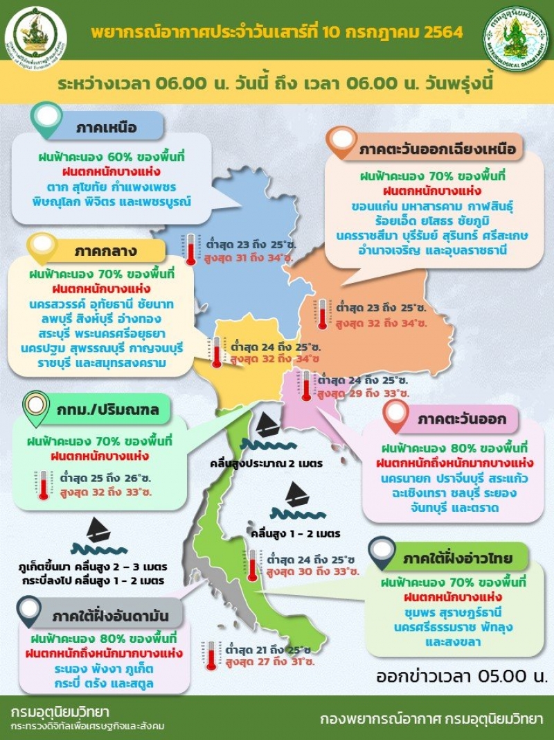สำหรับคลื่นลมบริเวณทะเลอันดามันตอนบนตั้งแต่จังหวัดภูเก็ตขึ้นมา ทะเลมีคลื่นสูง 2-3 เมตร บริเวณที่มีฝนฟ้าคะนองคลื่นสูงมากกว่า 3 เมตร ส่วนอ่าวไทยตอนบนมีคลื่นสูงประมาณ 2 เมตร บริเวณที่มีฝนฟ้าคะนองคลื่นสูงมากกว่า 2 เมตร ขอให้ชาวเรือบริเวณทะเลอันดามันและอ่าวไทยตอนบนระมัดระวังอันตรายในการเดินเรือบริเวณที่มีฝนฟ้าคะนอง และเรือเล็กบริเวณทะเลอันดามันตอนบนควรงดออกจากฝั่งจนถึงวันที่ 12 ก.ค. 64