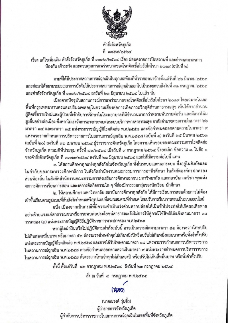 1. ให้สถานศึกษาทุกแห่งทุกสังกัดในจังหวัดภูเก็ต ทั้งในระบบและนอกระบบ ซึ่งอยู่ในสังกัดและในกำกับของกระทรวงศึกษาธิการ ในสังกัดสำนักงานคณะกรรมการการอาชีวศึกษา ในสังกัดองค์กรปกครองส่วนท้องถิ่น ในสังกัดสำนักงานคณะกรรมการส่งเสริมการศึกษาเอกชนมหาวิทยาลัย และสถาบันกวดวิชาทุกแห่งงดการจัดการเรียนการสอน และงดการจัดกิจกรรมใด ๆ ที่ต้องมีการรวมกลุ่มของนักเรียน นักศึกษา