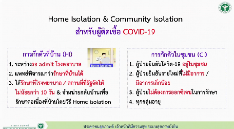 สำหรับการแยกกักตัวที่บ้านและแยกกักตัวในชุมชนนั้น ซึ่งได้กำหนดเกณฑ์ของผู้ติดเชื้อ ต้องสมัครใจและสามารถปฏิบัติตามคำแนะนำได้, สถานที่เหมาะสม ใช้จุดแข็งของไทยคือ บวร (บ้าน วัด โรงเรียน) โดย Home Isolation บ้านต้องมีห้องนอนแยก ส่วน Community Isolation ใช้วัด หรือโรงเรียน มีช่องทางสื่อสารผ่านเทเลคอนเฟอเรนซ์ วิดีโอคอล ติดตามอาการทุกวัน