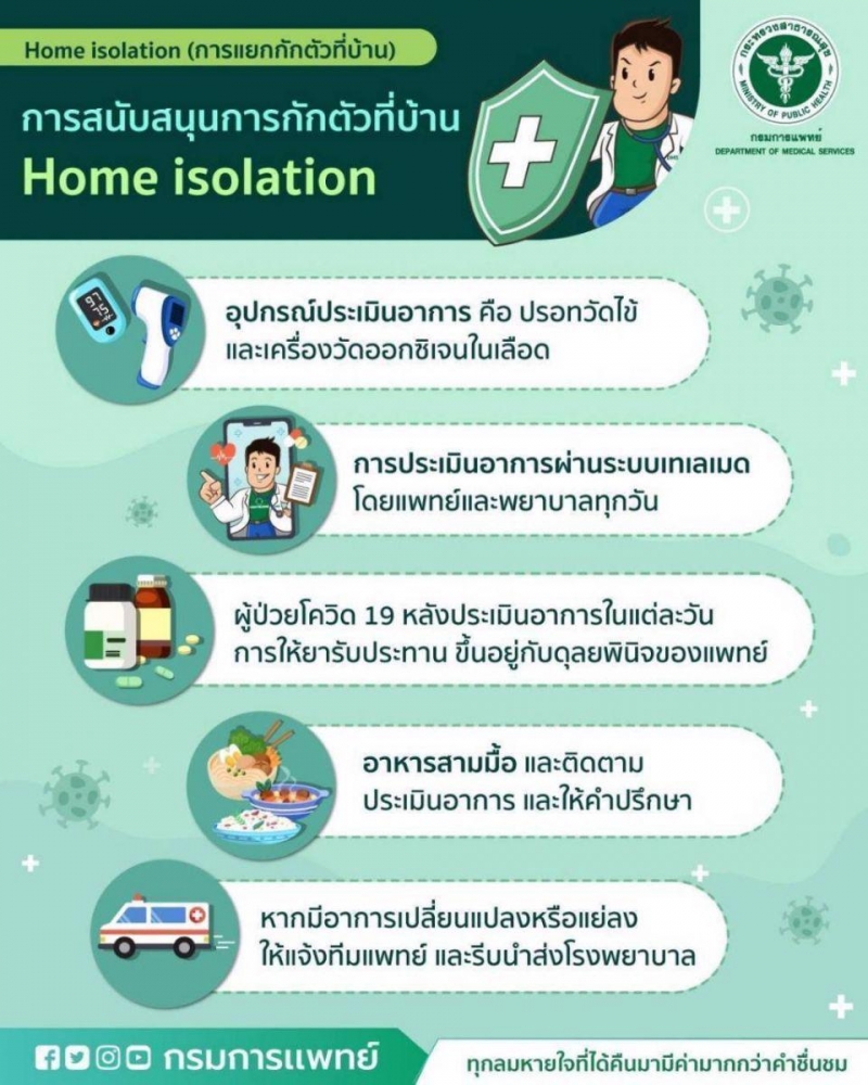 สำหรับเกณฑ์พิจารณาผู้ป่วย Home Isolation จะต้องเป็นผู้ติดเชื้อที่ไม่มีอาการ อายุไม่เกิน 60 ปี อยู่คนเดียวหรือมีผู้อยู่ร่วมที่พักไม่เกิน 1 คน ไม่มีภาวะอ้วน ไม่มีโรคร่วม เช่น ปอดอุดกั้นเรื้อรัง โรคไตเรื้อรัง โรคหัวใจและหลอดเลือด โรคหลอดเลือดสมอง เบาหวานที่ควบคุมไม่ได้ และยินยอมแยกตัวในที่พักของตนเอง โดยสถานพยาบาลจะประเมินผู้ติดเชื้อตามดุลยพินิจของแพทย์ ลงทะเบียน แนะนำการปฏิบัติตัว ติดตามประเมินอาการ และรับส่งผู้ป่วยมารักษาในสถานพยาบาลหากมีอาการรุนแรงขึ้น ซึ่งโครงการนี้ได้เริ่มทำแล้วที่โรงพยาบาลราชวิถี จำนวน 20 ราย ได้ผลดี ทุกรายอาการดีขึ้น