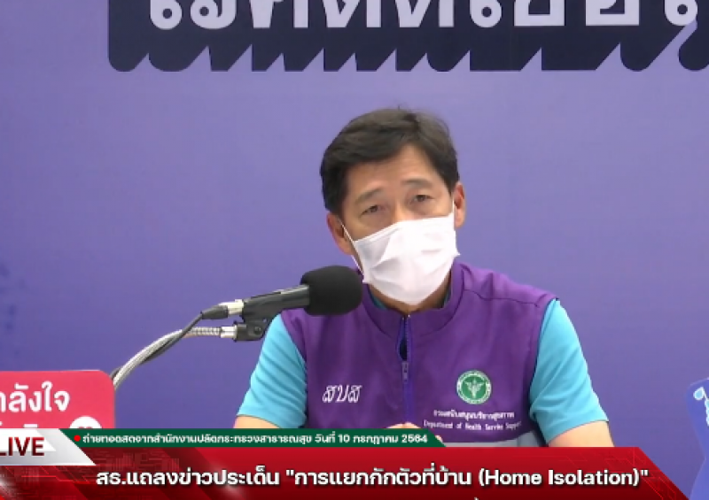 วันที่ 10 กรกฎาคม 2564 ที่ศูนย์แถลงข่าวโรคติดเชื้อไวรัสโคโรนา 2019 กระทรวงสาธารณสุข จ.นนทบุรี นายแพทย์สมศักดิ์ อรรฆศิลป์ อธิบดีกรมการแพทย์ พร้อมด้วยนายแพทย์ธเรศ กรัษนัยรวิวงค์ อธิบดีกรมสนับสนุนบริการสุขภาพ แถลงข่าวประเด็น “การแยกกักตัวที่บ้าน (Home Isolation) และการกักตัวในชุมชน (Community Isolation) นายแพทย์สมศักดิ์กล่าวว่า ขณะนี้ กระทรวงสาธารณสุข ได้นำ 2 มาตรการ คือ การแยกกักตัวที่บ้าน และการกักตัวในชุมชนมาใช้ เนื่องจากผู้ติดเชื้อโควิด 19 มีจำนวนมากขึ้น อัตราการครองเตียงของกทม.และปริมณฑลเพิ่มจากเดือนที่ผ่านมาถึง 10,000 ราย จากวันที่ 9 มิถุนายน 2564 มีผู้ป่วย 19,629 ราย เพิ่มเป็น 30,631 รายในวันที่ 9 กรกฎาคม 2564 โดยเป็นผู้ป่วยที่มีอาการไม่มาก (สีเขียว) ร้อยละ 76, อาการปานกลาง (สีเหลือง) ร้อยละ 20 และอาการหนัก (สีแดง) ร้อยละ 4 ซึ่งผู้ป่วยสีแดงเพิ่มขึ้นเกือบเท่าตัวจาก 714 ราย เป็น 1,206 ราย ทำให้บุคลากรแบกรับภาระงานหนักมาก และการเพิ่มบุคลากรผู้เชี่ยวชาญทำได้ยาก