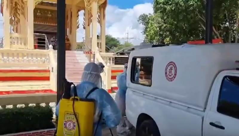 ในการประกอบพิธี เจ้าหน้าที่ได้สวมชุด PPE ป้องกันเชื้อโรคอย่างรัดกุม พร้อมฉีดพ่นน้ำยาฆ่าเชื้อ ทั้งก่อนและหลังการณาปนกิจสถานที่ ในบริเวณเมรุเผาศพ โดยแยกพระสงฆ์ห่างจากเมรุ โดยใช้สายสิญจน์โยงไปถึงศพและทำการเผา โดยมีสัปเหร่อเป็นประธานในการเผา ซึ่งทราบจาก นายศราวุฒิ บำรุงวุฒิ หน.กู้ภัยฯ ว่าทางญาติได้ฝากเก็บกระดูกคนตายไว้ให้ด้วย ภายในวันเสาร์ที่ 17 ก.ค. 64 จะให้ญาติมารับไปเพื่ออุทิศส่วนกุศลที่บ้านเกิด