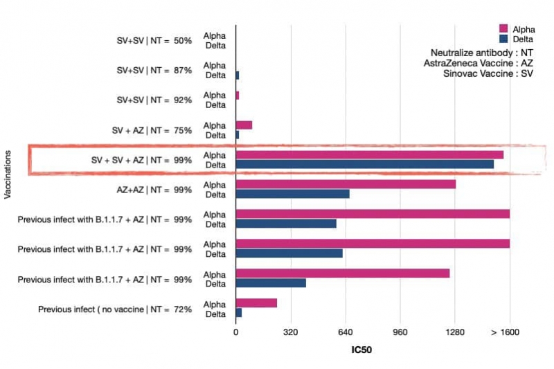 และเมื่อทำการวิเคราะห์รายที่ภูมิคุ้มกันยังอยู่ในระดับพอใช้ได้คือ 70% ปรากฏว่าสู้กับไวรัสแอลฟ่า และเดลต้าแทบไม่ได้เลย ซึ่งเป็นงานของอาจารย์ดร.อนันต์ ที่ไบโอเทคร่วมกันกับอาจารย์หมอเขตต์ สถาบันโรคทรวงอกและกับพวกเรา ที่วิเคราะห์ระดับภูมิคุ้มกันในเลือด