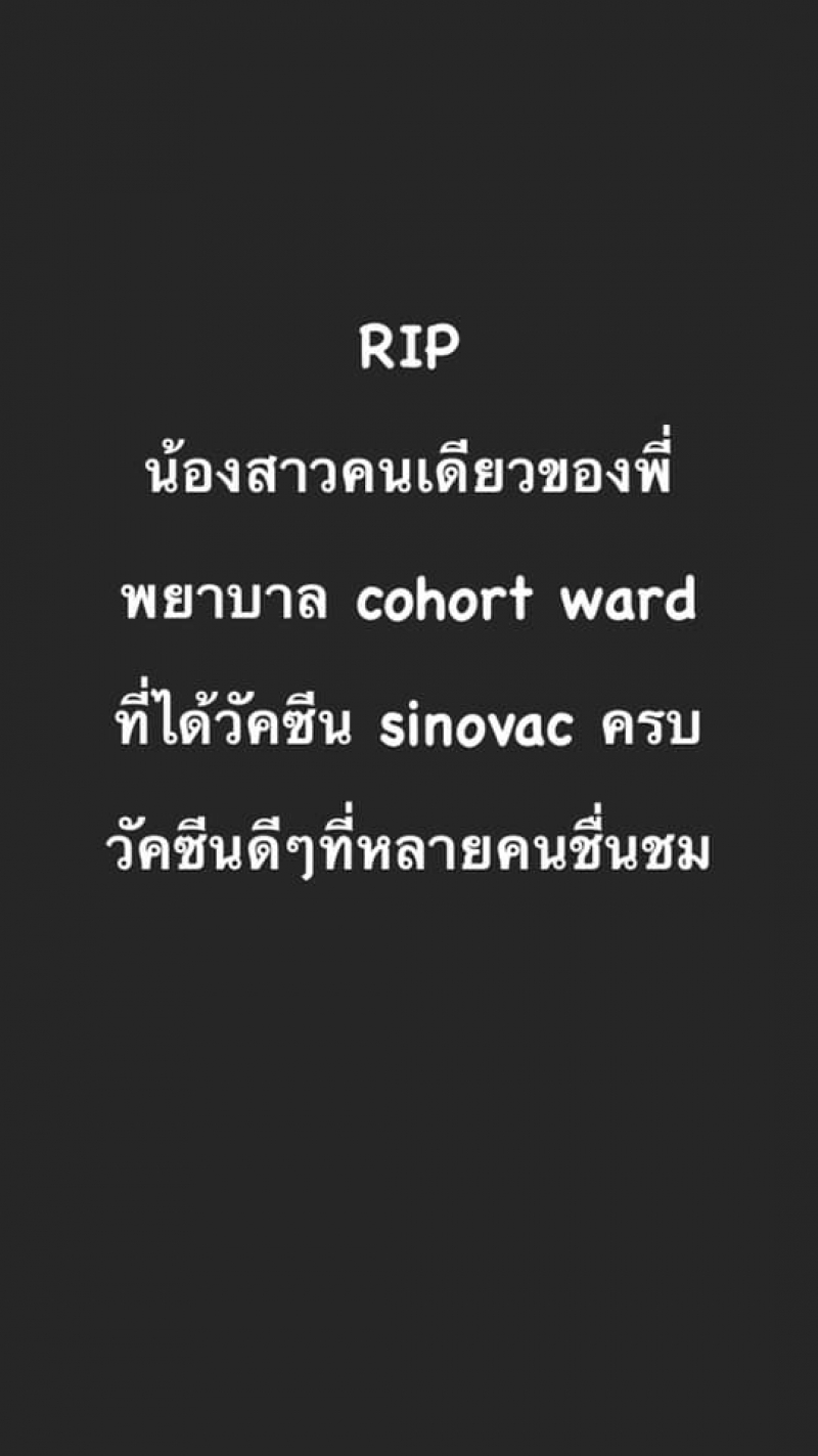 จากเหตุการณ์สะเทือนใจ เมื่อพี่สาวโพสต์อาลัยน้องสาว ซึ่งเป็นพยาบาลด่านหน้าเสียชีวิตเพราะติดเชื้อโควิด โดยระบุว่าน้องสาวฉีดวัคซีนซิโนแวคแล้ว 2 โดส ติดเชื้อจากการดูแลผู้ป่วยโควิด รักษาอยู่ 1 สัปดาห์ก็เสียชีวิต จึงตั้งคำถามถึงผู้ใหญ่ในกระทรวงสาธารณสุขว่า ต้องให้พวกเราตายกันอีกเท่าไหร่ ถ้าได้รับวัคซีนที่มีประสิทธิภาพดีกว่านี้ เราคงจะไม่เสียน้องไป