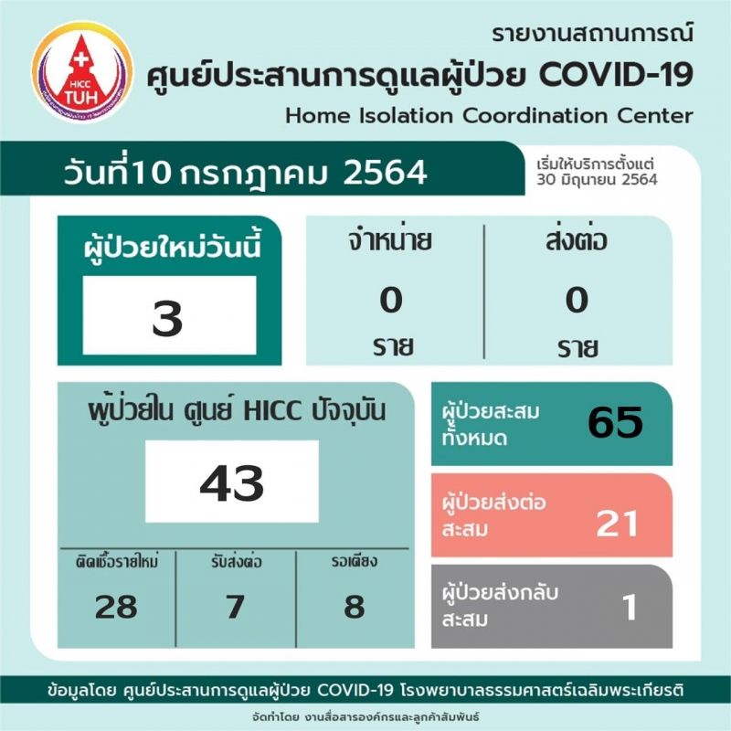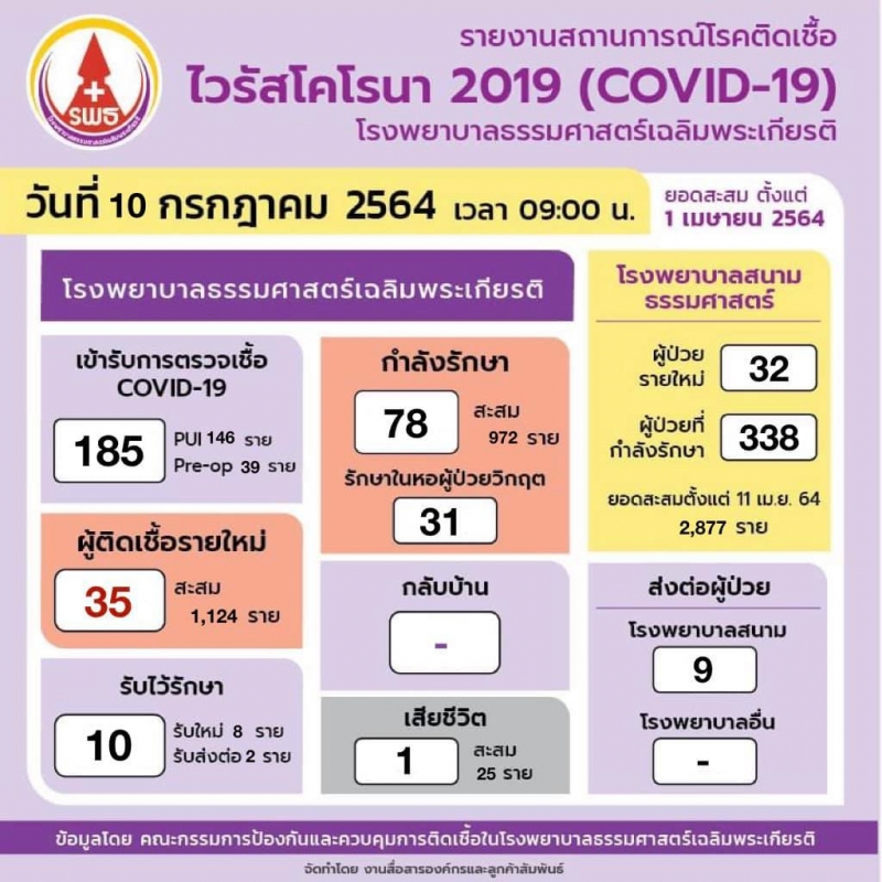 วันที่ 11 ก.ค.64 เฟซบุ๊กเพจ โรงพยาบาลสนามธรรมศาสตร์ รายงานว่า สถานการณ์ที่ธรรมศาสตร์วันนี้ก็ โกลาหลไม่แพ้สถานการณ์ของประเทศ เพราะเช้านี้เราพบว่ามีอาจารย์GI เภสัชกร และเจ้าหน้าที่ฝ่ายคลังของเรา มีผลตรวจเป็นบวกสามคน กับมีผู้ป่วยที่พักรักษาตัวมาหลายวันแล้วใน ward Ortho และใน ward CVTก็มีผล swab เป็นบวกด้วย