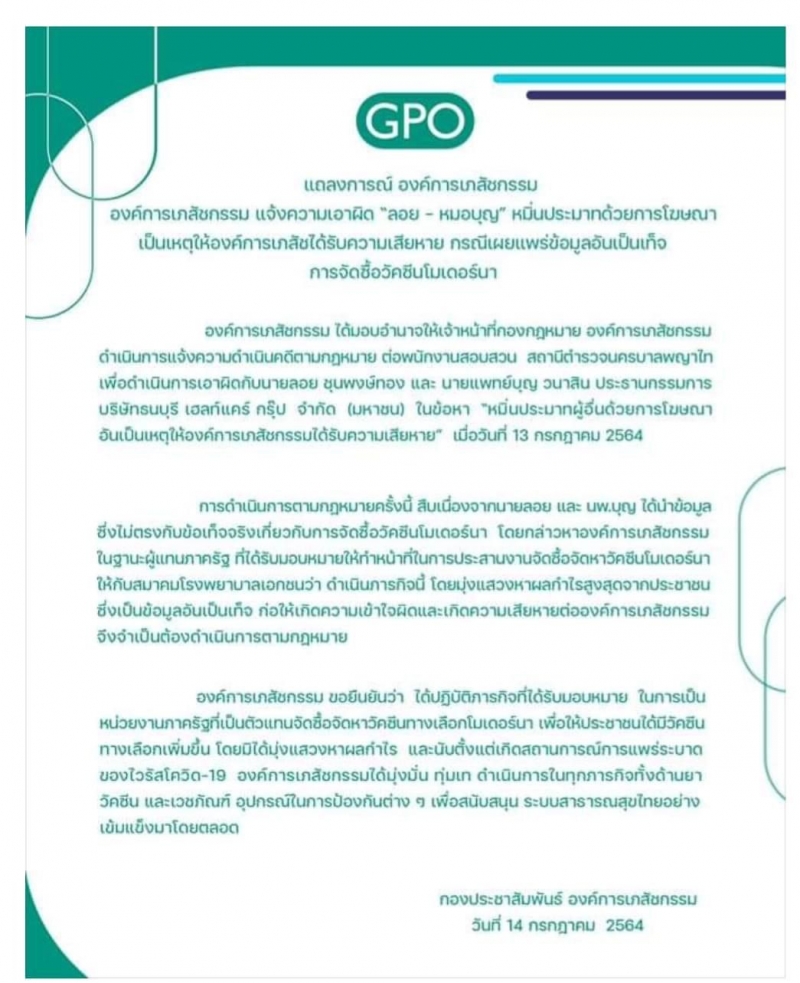 องค์การเภสัชกรรม ออกแถลงการณ์ เรื่องแจ้งความเอาผิด "ลอย - หมอบุญ" หมิ่นประมาทด้วยการโฆษณา เป็นเหตุให้องค์การเกสัชได้รับความเสียหาย กรณีเผยแพร่ข้อมูลอันเป็นเท็จการจัดซื้อวัคซีนโมเดอร์นา โพสต์ผ่านเพจเฟซบุ๊กองค์การเภสัช โดยมีรายละเอียดว่า