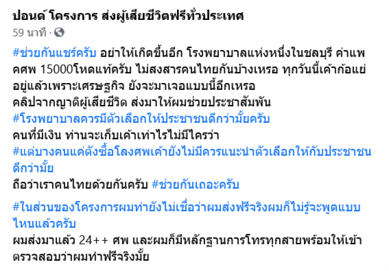 โดยผู้โพสต์ระบุว่าอย่าให้เกิดขึ้นอีก โรงพยาบาลแห่งหนึ่งในชลบุรี ค่าแพค ศ พ 15000โหดแท้ครับ ไม่สงสารคนไทยกันบ้างเหรอ ทุกวันนี้เค้าก้อแย่อยู่แล้วเพราะเศรษฐกิจ ยังจะมาเจอแบบนี้อีกเหรอ คลิปจากญาติผู้เสียชีวิต