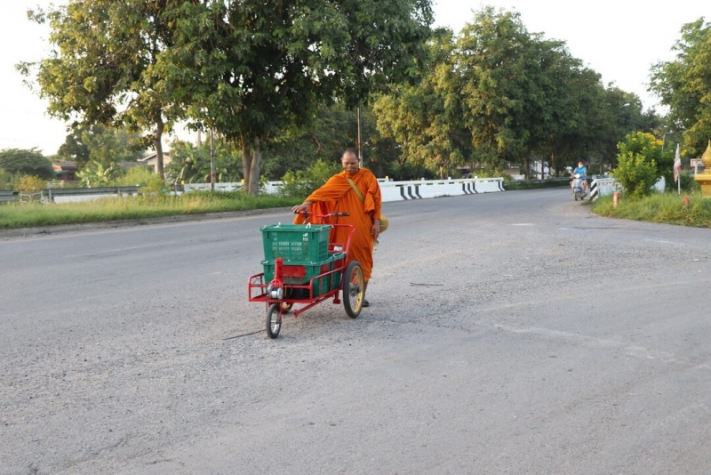 ก่อนหน้านี้อาตมาใช้วิธีเดินเท้ารับบิณฑบาต แล้วใช้รถเข็นรับสิ่งของใส่บาตร จนเมื่อ 2 เดือนที่ผ่านมาทางเจ้าอาวาสได้ทำการดัดแปลงสกูตเตอร์ไฟฟ้ามาติดตั้งกับรถเข็นของที่ใช้บิณฑบาตตอนเช้าให้ เพราะเห็นว่าต้องเดินทางไกล เข็นของหนัก