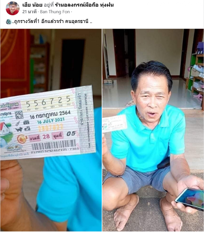 ล่าสุดในโลกออนไลน์ ได้มีผู้ใช้เฟซบุ๊กชื่อ เฮีย น้อย ได้โพสต์ภาพผู้ที่ถูกรางวัลที่ 1 หมายเลข 556725 พร้อมระบุว่า ถูกรางวัลที่1 อีกแล้วจร้า คนอุดรธานี ท่ามกลางชาวโซเชียลที่แห่เข้ามาแสดงความยินดี