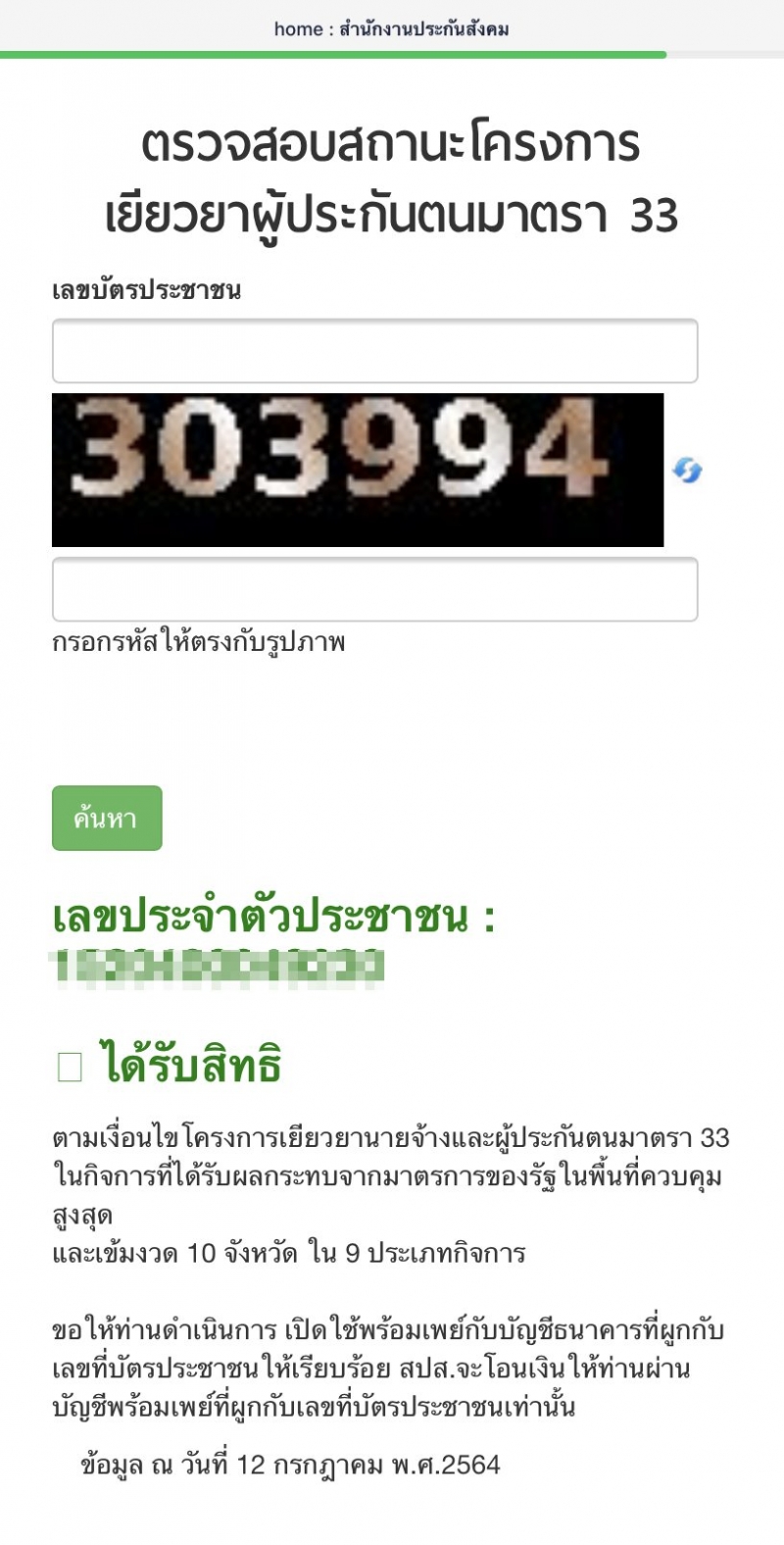 คลิก ตรวจสอบสิทธิโครงการเยียวยาฯผู้ประกันตน (มาตรา 33) หรือ ตรวจสอบสิทธิโครงการเยียวยาฯ (นายจ้าง)