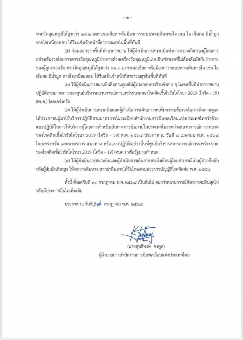 โดย นายสุทธิพงษ์ คงพูล ผู้อำนวยการสำนักงานการบินพลเรือนแห่งประเทศไทย (กพท.) ได้ลงนามในประกาศ กพท. เรื่อง แนวปฏิบัติสำหรับผู้ดำเนินการสนามบินและผู้ดำเนินการเดินอากาศในเส้นทางการบินภายในประเทศ ในระหว่างสถานการณ์Cv-19 ฉบับที่ 3