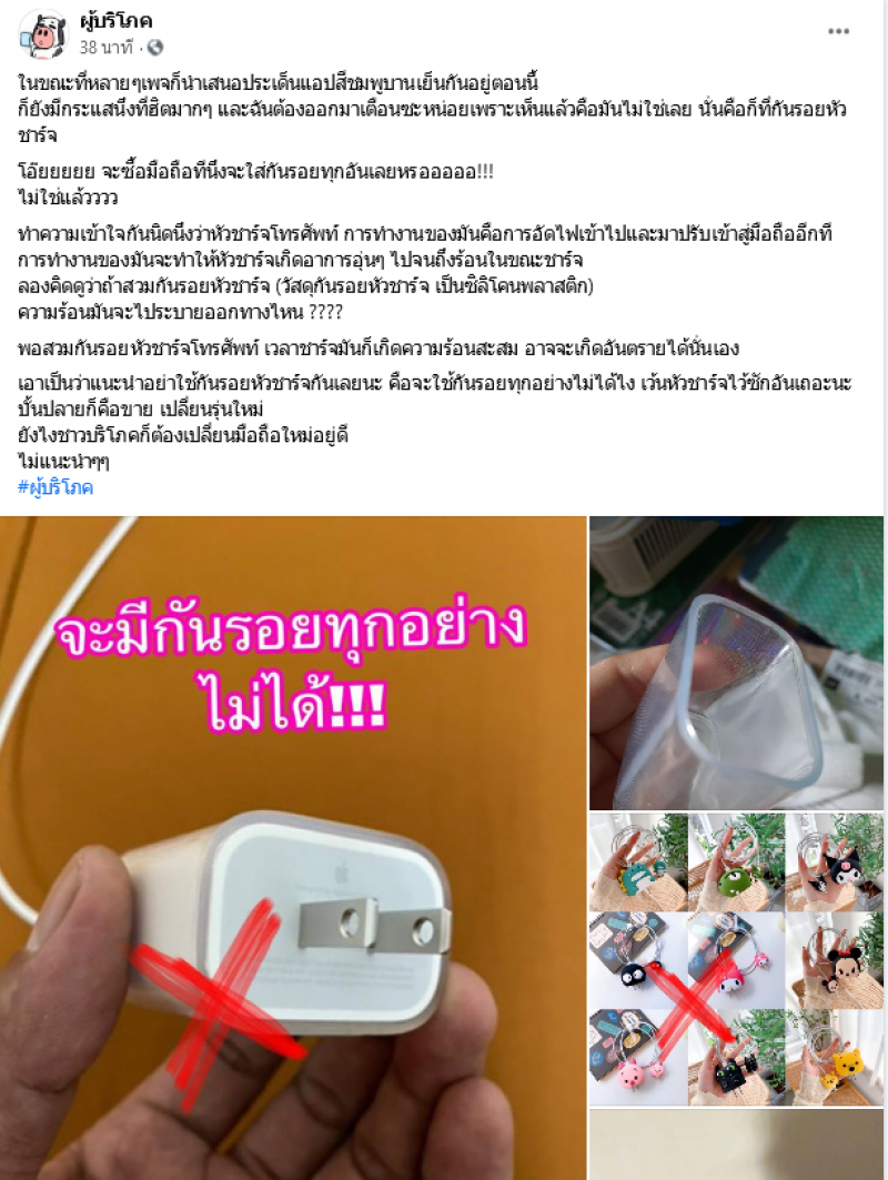 วันที่ 19 กรกฎาคม เฟซบุ๊กเพจ ผู้บริโภค ได้มีการโพสต์สำหรัยใครที่คิดจะซื้ออุปกรณ์กันรอยหัวชาร์จ โดยระบุว่า โอ๊ยยยยย จะซื้อมือถือทีนึงจะใส่กันรอยทุกอันเลยหรอออออ ไม่ใช่แล้วววว ทำความเข้าใจกันนิดนึงว่าหัวชาร์จโทรศัพท์ การทำงานของมันคือการอัดไฟเข้าไปและมาปรับเข้าสู่มือถืออีกที