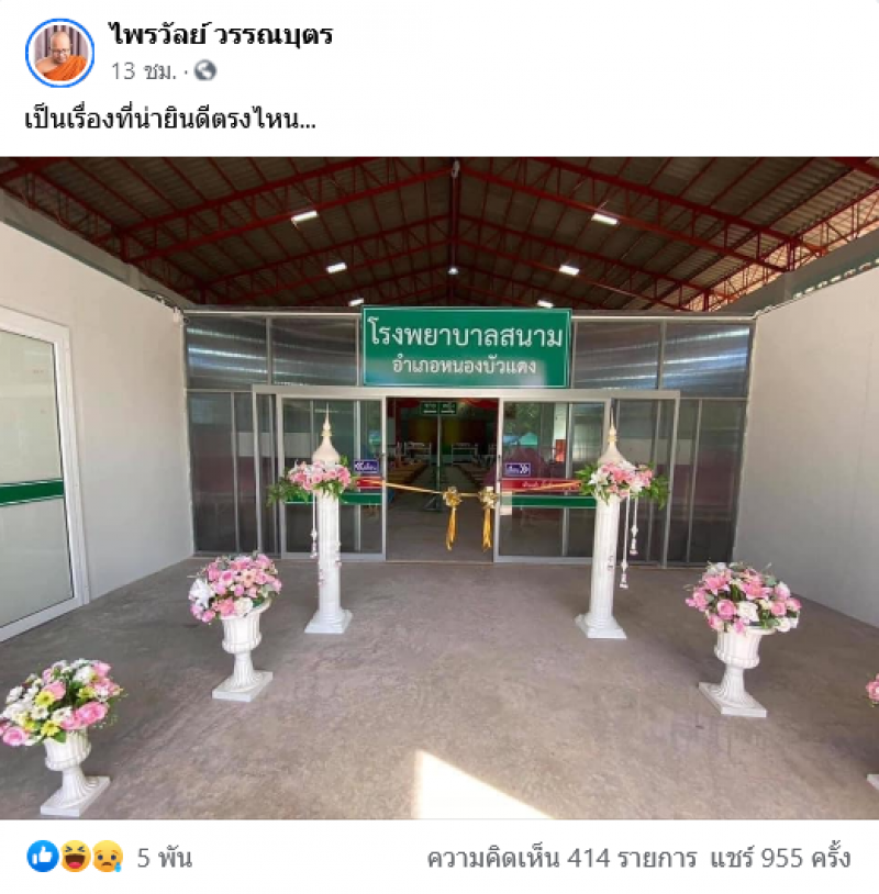 ผู้สื่อข่าวรายงานว่า ในเฟซบุ๊กเพจของ พระมหาไพรวัลย์ วรวณฺโณ ได้มีการโพสต์รูปซุ้มตัดริบบิ้น เปิดโรงพยาบาลสนาม อำเภอหนองบัวแดง จังหวัดชัยภูมิ จนกลายเป็นวิพากษ์วิจารณ์อย่างมาก และถูกตั้งคำถามว่า เป็นเรื่องที่น่ายินดีตรงไหน พร้อมระบุข้อความอีกว่า