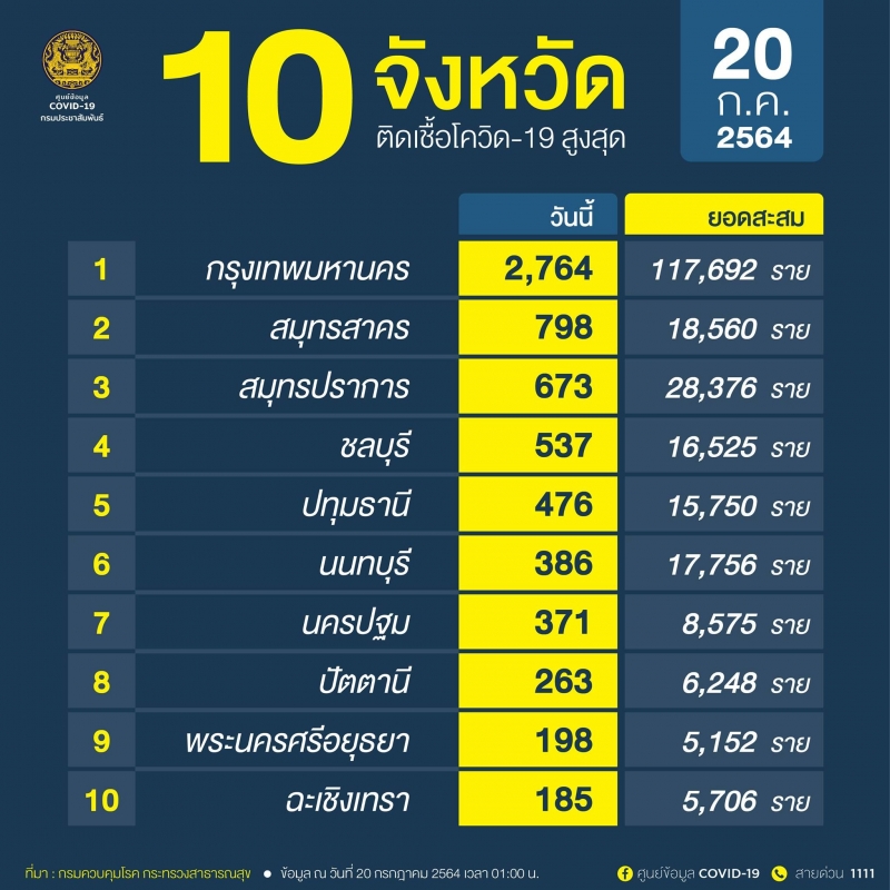 จํานวนผู้ติด เ ชื้ อ โ ค วิ ด ในประเทศรายใหม่ วันที่ 20 กรกฎาคม 2564 ตรวจสอบ 10 จังหวัดอันดับแรก