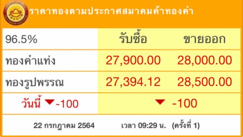 ราคาซื้อขายทองคำในประเทศชนิด 96.5% วันพฤหัสบดีที่ 22 กรกฎาคม2564 (ประกาศครั้งที่ 1) ราคาทองรูปพรรณ ขายออกบาทละ 28,500 บาท รับซื้อบาทละ 27,394.12 บาท