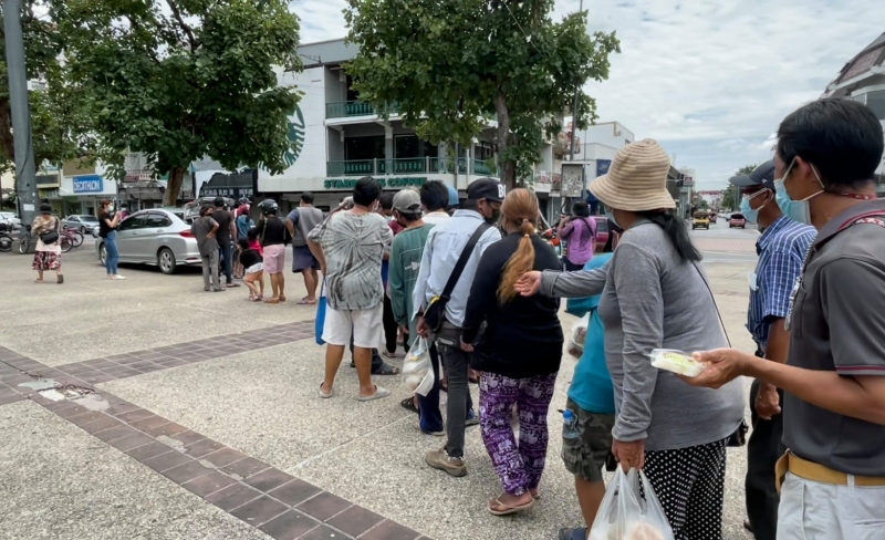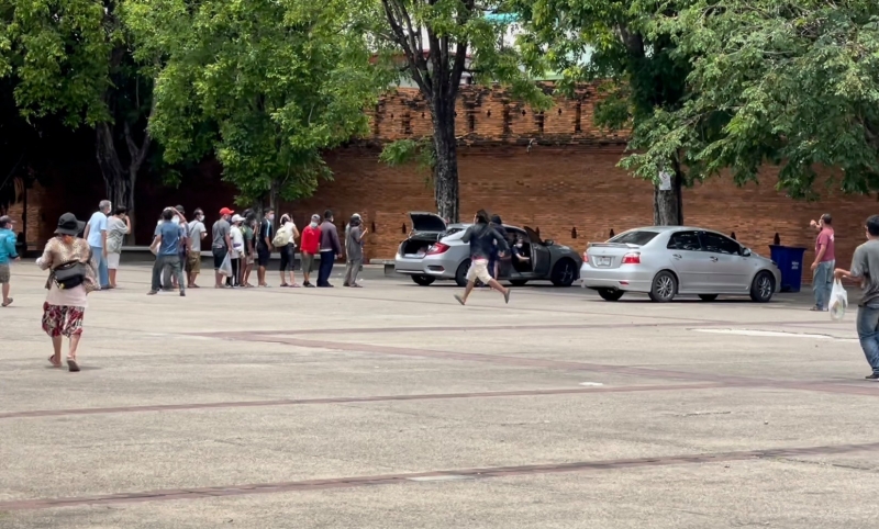 วันที่ 23 ก.ค.64 ที่บริเวณลานเอนกประสงค์ ข่วงประตูท่าแพ อ.เมืองเชียงใหม่ ประชาชนทั้งชายทั้งหญิง จำนวนหลายสิบคน ต่างเฮโลวิ่งเข้าไปรุมต่อแถวแย่งข้าวกล่องที่มีผู้ใจบุญนำมาแจกในช่วงเที่ยงของวันนี้ ที่ก่อนหน้านี้สถานที่แห่งนี้เคบเป็นแลนด์มาร์คแหล่งท่องเที่ยว ขึ้นชื่อของจังหวัดเชียงใหม่อีกแห่งหนึ่ง ที่มักมีนักท่องเที่ยวทั้งชาวไทย และต่างชาตินิยมเดินทางมาถ่ายภาพ
