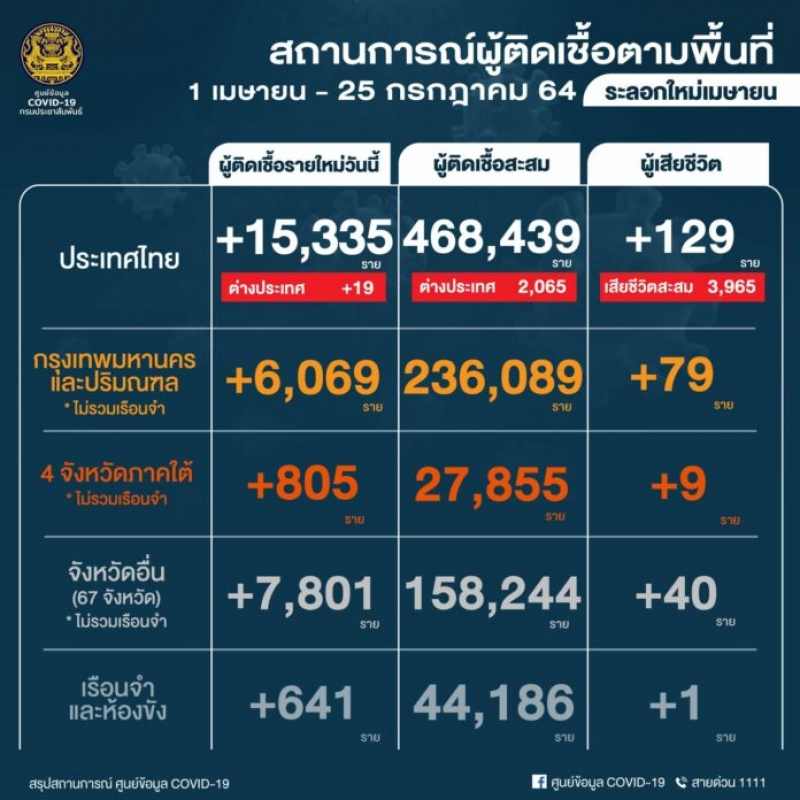 วันที่ 25 ก.ค.64 มีรายงานสถานการณ์การระบาดของโควิด 19 ว่า วันนี้ยอดผู้ติดเชื้อทำ New High อีกแล้ว โดยผู้ติดเชื้ออยู่ที่ 15,335 ราย เป็นติดเชื้อในประเทศ 15,319 ราย จากต่างประเทศ 19 ราย เป็นการตรวจเชิงรุก 2,916 ราย และวอล์กอิน 11,759 ราย