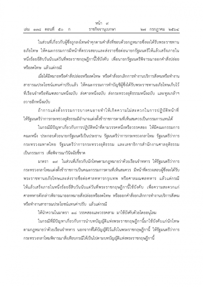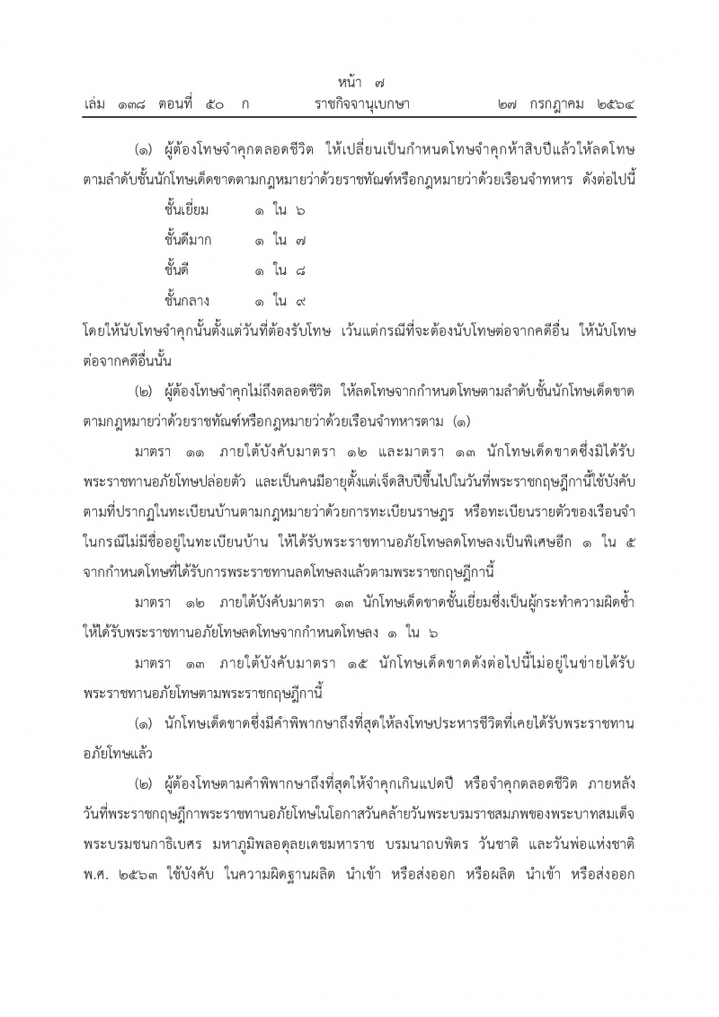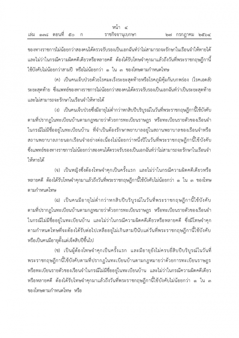 วันที่ 27 ก.ค. เว็บไซต์ราชกิจจานุเบกษา เผยแพร่พระราชกฤษฎีกา พระราชทานอภัยโทษ พ.ศ. ๒๕๖๔