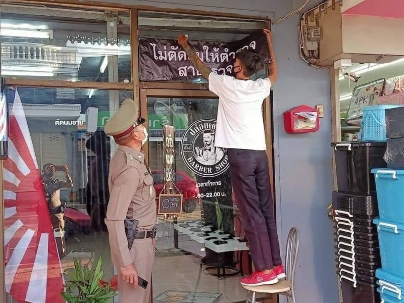 อย่างไรก็ตาม เมื่อวันที่ 27 ก.ค.ที่ผ่านมา เพจ โปลิศไทยแลนด์ - Police Thailand News ได้ออกมาโพสต์ภาพเจ้าของร้านตัดผมใน จ.อุบลราชธานี ขณะกำลังปลดป้ายไวนิล ไม่ตัดผมให้ตำรวจสายตรวจลง โดยมีเจ้าหน้าที่ตำรวจยืนอยู่ข้างกาย