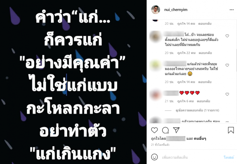 ล่าสุด ไม่รู้ว่าที่ นุ้ย เชิญยิ้ม โพสต์ไปหมายถึงใครกันแน่ แต่งานนี้ คอมเมนต์ในไอจีมีทั้งแสดงความคิดเห็นวิพากษ์วิจารณ์ กันไปต่างๆ นานา ว่าหมายถึงใคร โดย นุ้ย เชิญยิ้ม โพสต์ข้อความบอกว่า คำว่า แ ก่ ก็ควร แ ก่ อย่างมีคุณค่า ไม่ใช่ แ ก่ แบบ กะ โหล ก กะลา อย่าทำตัว แ ก่ เกิน แกง