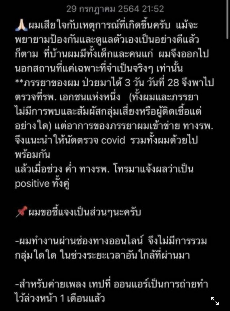 จากกรณีที่นักร้องดัง เอ๊ะ - จิรากร สมพิทักษ์ ได้ออกมาประกาศข่าวผ่านอินสตาแกรม ระบุว่าตนเองนั้นติด cv-19 และ ภรรยาก็ติดด้วย พร้อมทั้งแจ้งไทม์ไลน์ ส่วนลูกๆนั้นรอผลตรวจ โดยเจ้าตัวเผยว่า