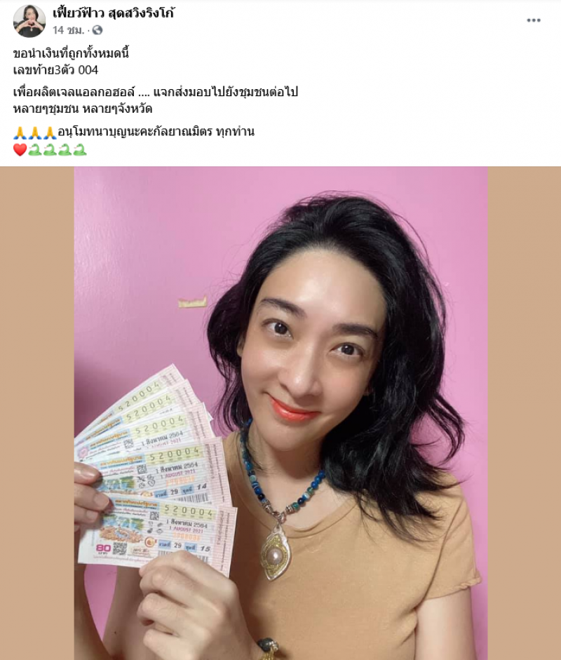 เรียกได้ว่าเป็นนักแสดงสาวสายบุญที่มัก ถูกรางวัลลอตเตอรี่อยู่บ่อยๆ สำหรับ เฟี้ยว์ฟ้าว สุดสวิงริงโก้ อย่างล่าสุด เมื่อวันที่ 1 สิงหาคม 2564 ที่ผ่านมา เฟี้ยว์ฟ้าว ได้นำลอตเตอรี่ที่ถูกรางวัลเลขท้าย 3 ตัว 004 มาบอกแก่แฟนๆ ในเฟซบุ๊ก พร้อมกับเผยว่าเงินทั้งหมดจะนำไปช่วยเหลือด้าน cv-19 โดย เฟี้ยว์ฟ้าว ระบุว่า "ขอนำเงินที่ถูกทั้งหมดนี้ เลขท้าย3ตัว 004 เพื่อผลิตเจลแอลกอ ฮอล์ …. แจกส่งมอบไปยังชุมชนต่อไป หลายๆชุมชน หลายๆจังหวัด อนุโมทนาบุญนะคะกัลยาณมิตร ทุกท่าน"