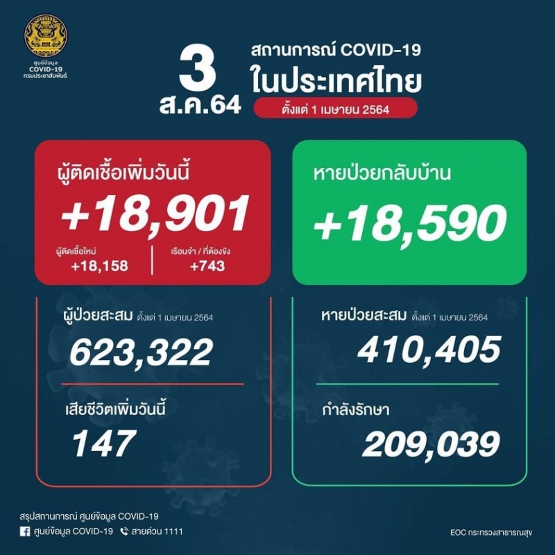 วันที่ 3 ส.ค.64 ศูนย์ข้อมูลโควิด-19 รายงานสถานการณ์โควิดในประเทศไทย พบผู้ป่วยใหม่รวม 18,901 ราย จำแนกเป็น ติดเชื้อใหม่ 18,158 ราย ติดเชื้อภายในเรือนจำ/ที่ต้องขัง 743 ราย ผู้ป่วยสะสม 623,322 ราย (ตั้งแต่ 1 เมษายน) หายป่วยกลับบ้าน 18,590 ราย หายป่วยสะสม 410,405 ราย (ตั้งแต่ 1 เมษายน) ผู้ป่วยกำลังรักษา 209,039 ราย เสียชีวิต 147 ราย