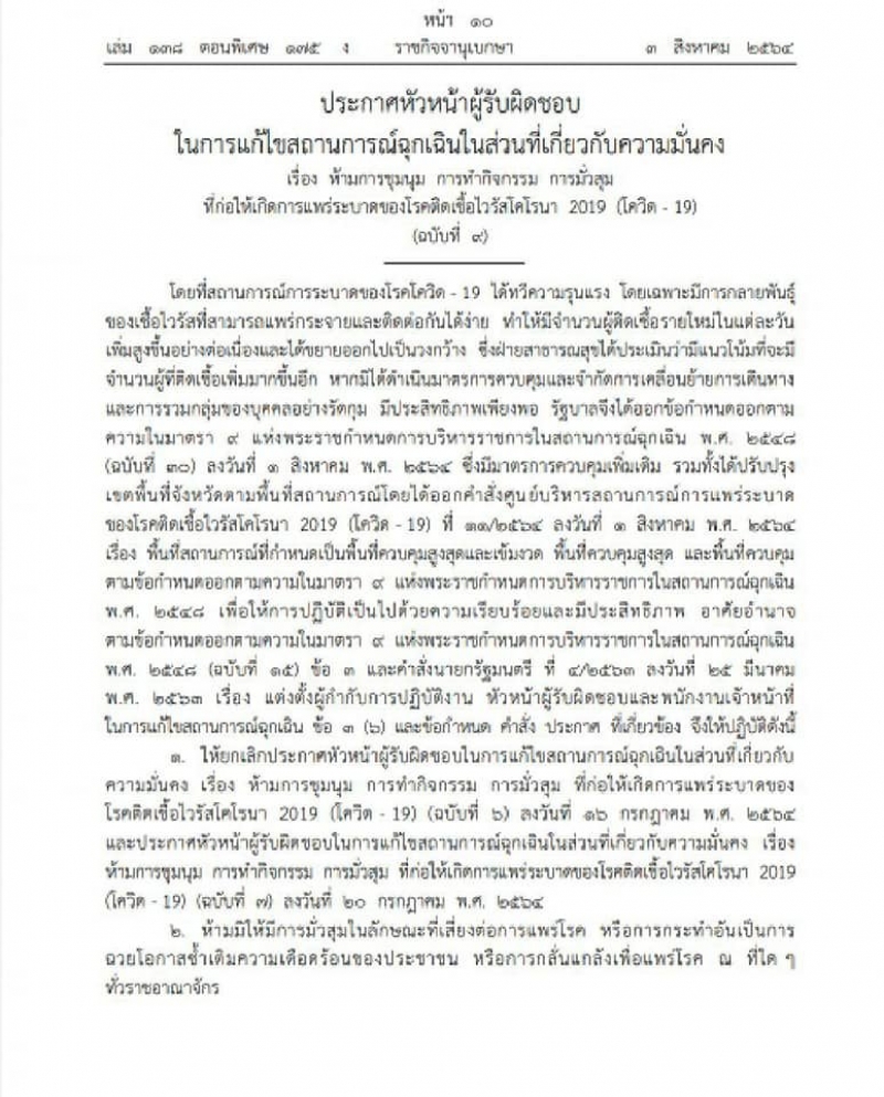 ช่วงดึกคืนวานนี้ (3 สิงหาคม 2564) เว็บไซต์ ราชกิจจานุเบกษา เผยแพร่ประกาศหัวหน้าผู้รับผิดชอบในการแก้ไขสถานการณ์ฉุกเฉินในส่วนที่เกี่ยวกับความมั่นคง เรื่อง ห้ามการชุมนุม การทำกิจกรรม การมั่วสุม ที่ก่อให้เกิดการแพร่ระบาดของโรคติดเชื้อไวรัสโคโรนา 2019 (โควิด-19) (ฉบับที่ 9) พร้อมระบุว่า สถานการณ์การระบาดของโรคโควิด-19 ได้ทวีความรุนแรง โดยเฉพาะมีการกลายพันธุ์ของเชื้อไวรัสที่สามารถแพร่กระจายและติดต่อกันได้ง่าย ทำให้มีจำนวนผู้ติดเชื้อรายใหม่ในแต่ละวันเพิ่มสูงขึ้นอย่างต่อเนื่องและได้ขยายออกไปเป็นวงกว้าง