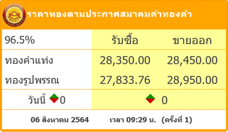 วันที่ 6 สิงหาคม 2564 สมาคมค้าทองคำรายงาน ราคาทองไทย ครั้งที่ 1 เมื่อเวลา 09:29 น. โดยราคาทองล่าสุดราคานั้น ยังคงที่จาเดิม ส่งผลทำให้ราคาวันนี้ทองคำแท่ ง รับซื้อบาทละ 28,350 ขายออกบาทละ 28,450 บาท ส่วนทองรูปพรรณ รับซื้อบาทละ 27,833.76 ขายออกบาทละ 28,950 บาท
