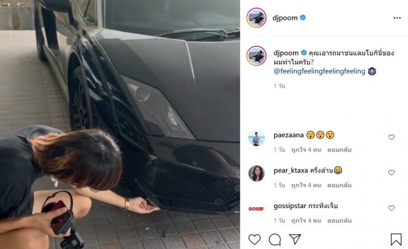 กลายเป็นที่ฮือฮา เมื่อ ดีเจภูมิ โพสต์คลิปเผยภาพรถหรูคันสวยโดนชนด้านหน้ามีรอยเสียหายเยินคนรักรถใจหาย พร้อมแคปชั่นว่า คุณเอารถมาชนแลมโบกินี่ของผมทำไมครับ โดยในคลิปดีเจภูมิบอกติดตลกด้วยว่า คุณไม่ต้องกราบรถผมนะครับ เดี๋ยวคนจะมาด่าผม ทำไมคุณทำรถผมแบบนี้ครับ อีกฝ่ายก็บอกว่า ไม่ได้ตั้งใจครับ มองไม่เห็น ส่วนดีเจภูมิได้แต่ร้องลั่น