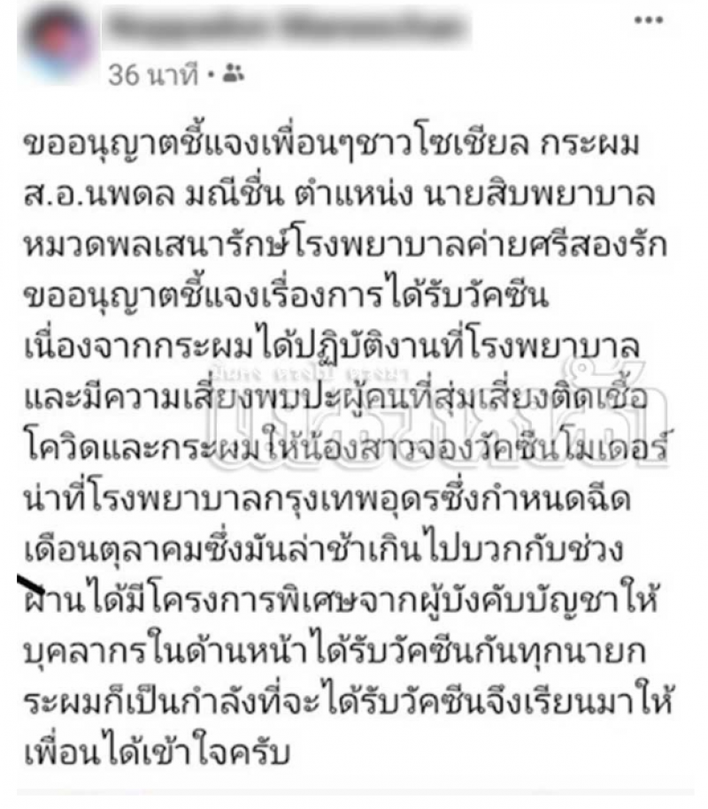 ล่าสุดด้าน ส.อ.นพดล มณีชื่น ทหารรายที่ตกเป็นข่าว ได้ชี้แจงกับผู้สี่อข่าว ขณะที่กำลังสวมชุด PPE ว่า ตนเป็นนายสิบพยาบาล สังกัดหมวดพลเสนารักษ์ โรงพยาบาลค่ายศรีสองรัก ปฏิบัติหน้าที่อยู่ด่านหน้า จุดคัดกรองที่โรงพยาบาลสนามจังหวัดเลยแห่งที่ 3 ภายในหน่วยฝึกนักศึกษาวิชาทหาร มณฑลทหารบกที่ 28 ค่ายศรีสองรัก ได้มีคำสั่งจากผู้บังคับบัญชาให้ไปรับวัคซีนเมื่อวานนี้ เพราะตนปฏิบัติหน้าที่ เสี่ย ง อยู่ใกล้ชิด สัมผัสผู้ป่ว ย
