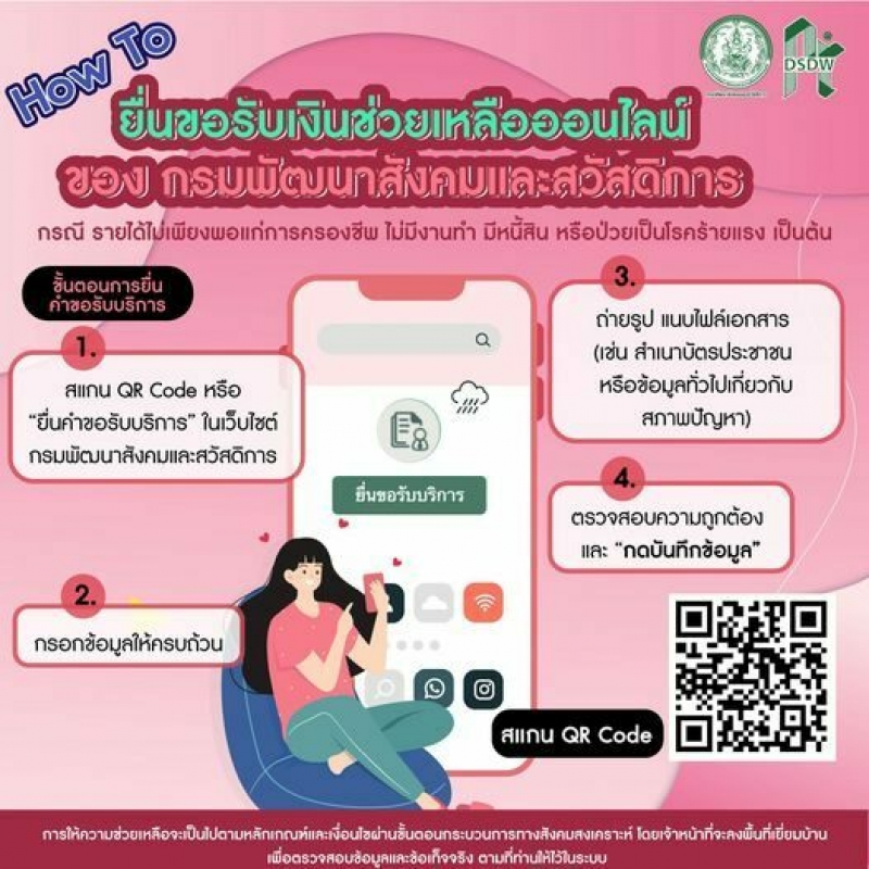 1.สแกน QR Code หรือ ยื่นคำขอรับบริการ ในเว็บไซต์ : กรมพัฒนาสังคมและสวัสดิการ