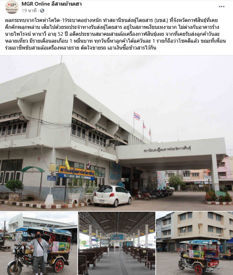 วันที่ 11 สิงหาคม ในเฟซบุ๊กเพจ MGR Online อีสานบ้านเฮา ได้มีการโพสต์ภาพพร้อมระบุว่า ผลกระทบจาก cv-19ระบาดอย่างหนัก ทำสถานีขนส่งผู้โดยสาร (บขส.) ที่จังหวัดกาฬสินธุ์ที่เคยคึกคักพลุกพล่าน เต็มไปด้วยรถประจำทางรับส่งผู้โดยสาร อยู่ในสภาพเงียบเหงามาก ไม่ต่างกับอาคารร้าง นายไพโรจน์ หานาวี อายุ 52 ปี อดีตประธานสมาคมสามล้อเครื่องกาฬสินธุ์เผย จากที่เคยรับส่งลูกค้าวันละหลายเที่ยว มีรายเดือนละเกือบ 1 หมื่นบาท ทุกวันนี้หาลูกค้าได้แค่วันละ 1 รายก็ถือว่าโช คดีแล้ว ขณะที่เพื่อนร่วมอาชีพขับสามล้อเครื่องหลายราย ตัดใจขายรถ เอาเงินซื้อข้าวสารไว้กิน