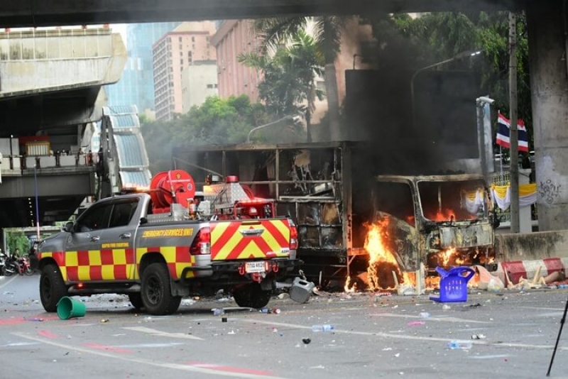 ซึ่งผู้ต้องหาทั้ง 2 ราย ให้การรับสารภาพ ว่าในวันเกิดเหตุได้เผาทำลายรถตำรวจควบคุมผู้ต้องหาจริง โดยตนได้หยิบขวดใส่น้ำมัน ก่อนจุดไฟแล้วขว้างเข้าไปในรถตำรวจ ที่บริเวณอนุสาวรีย์ชัยสมรภูมิ
