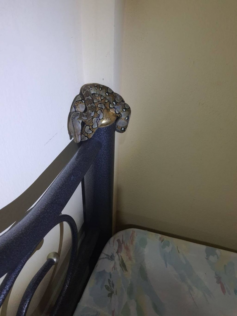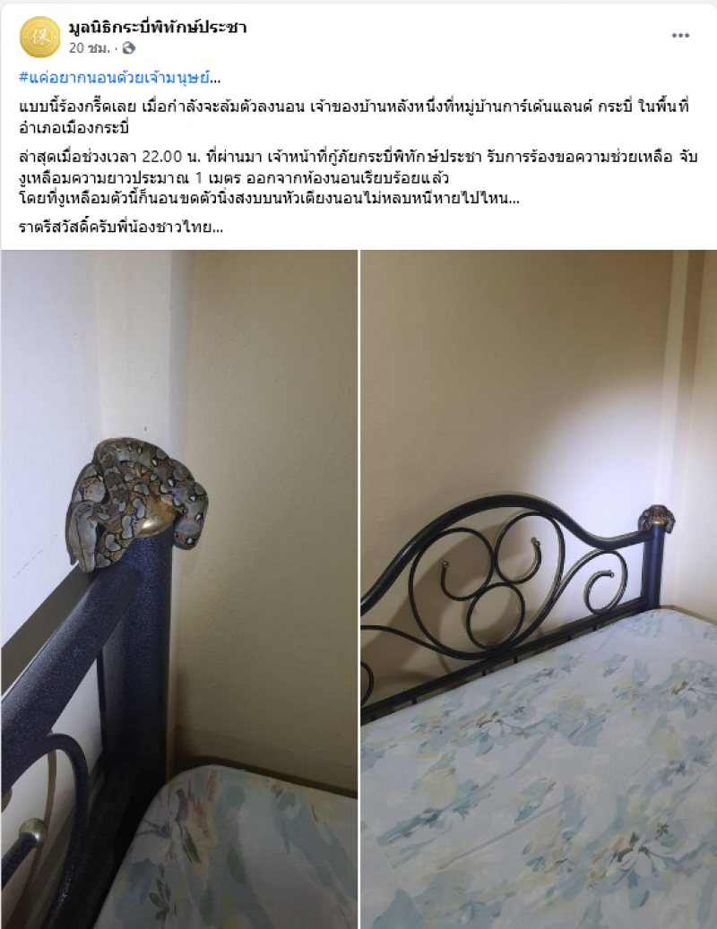 จากกรณีเพจเฟซบุ๊ก มูลนิธิกระบี่พิทักษ์ประชา โพสต์ภาพเหตุการณ์เตือนภัยประชาชนที่เกิดขึ้นกับเจ้าของบ้านหลังหนึ่ง ขณะกำลังจะล้มตัวลงนอน กลับเหลือบไปเห็น "งูเหลือม" นอนขดอยู่บริเวณเสาของหัวเตียง สร้างความตกใจให้กับเจ้าของบ้านเป็นอย่างมาก