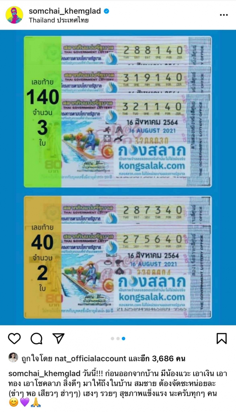โดย เต๋า สมชาย ได้มีการเผยภาพลอตเตอรี่ที่ซื้อกับเว็บกองสลากถึง 5 ใบกันเลยทีเดียว งานนี้เชื่อเลยว่าแฟนต่างไม่พลาดนำไปซื้อรางวัลกันอย่างแน่นอน