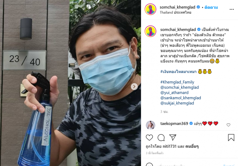 จากกรณีที่ ดาราหนุ่มรุ่นเก๋าอย่าง เต๋า สมชาย ได้มีการโพสต์ผ่านอินสตาแกรมส่วนตัว มีตัวเงินตัวทองเข้าบ้าน โดยระบุว่า วันนี้ ก่อนออกจากบ้าน มีน้องแวะ เอาเงิน เอาทอง เอาโช คลา ภ สิ่งดีๆ มาให้ถึงในบ้าน สมชาย ต้องจัดซะหน่อยละ (ขำๆ พอ เสีย วๆ ฮ่าๆๆ) เฮงๆ รว ยๆ สุขภาพแข็งแรง นะครับทุกๆ คน
