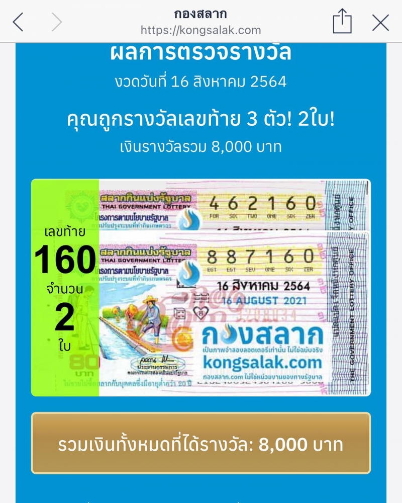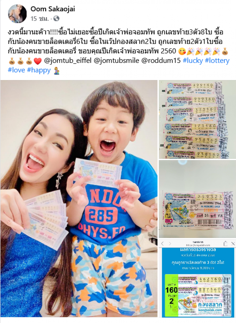 เรียกได้ว่าเป็นอีกหนึ่งดาราที่ถูกรางวัลบ่อยมากสำหรับ อ๋อม สกาวใจ ที่ล่าสุดได้เฮลั่นอีกแล้ว กับผลสลากกินแบ่งรัฐบาล ประจำวันที่ 16 ส.ค. 2564 โดย แม่อ๋อม โพสต์ภาพถูกรางวัลคู่กับลูกชาย ระบุว่า งว ดนี้มานะคะ ซื้อไม่เยอะ ซื้อปีเกิดเจ้าพ่อจอมทัพ ถูกเลขท้าย 3 ตัว 8 ใบ ซื้อกับน้องคนขายล็อตเตอรี่ 6 ใบ ซื้อในเว็บกองสลาก 2 ใบ ถูกเลขท้าย 2 ตัว 1 ใบ ซื้อกับน้องคนขายล็อตเตอรี่ ขอบคุณปีเกิดเจ้าพ่อจอมทัพ2560