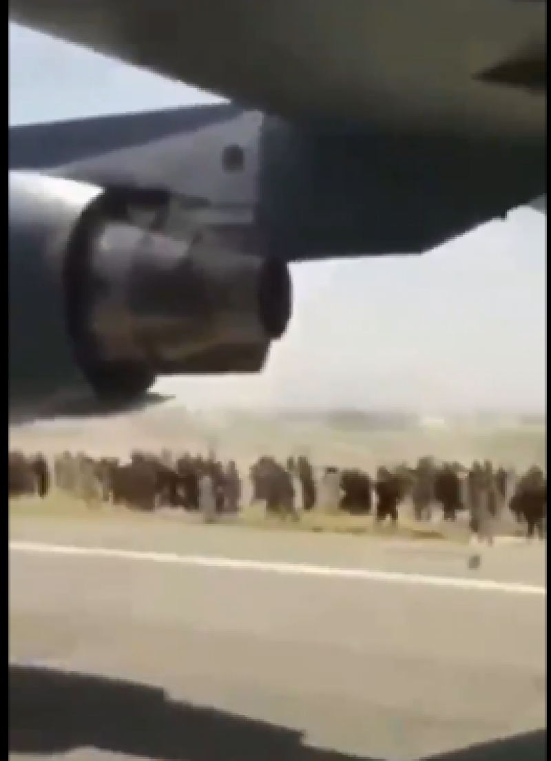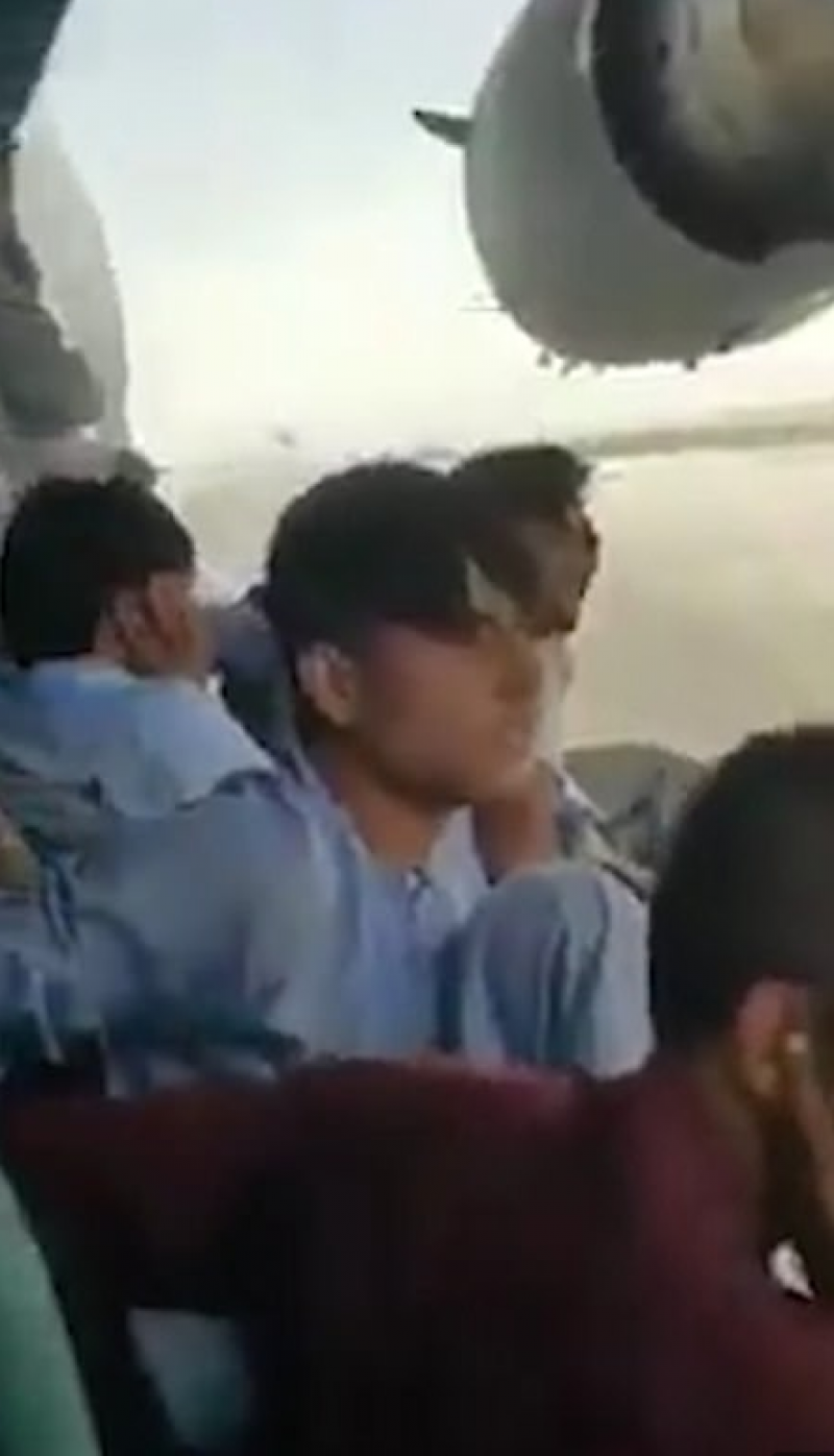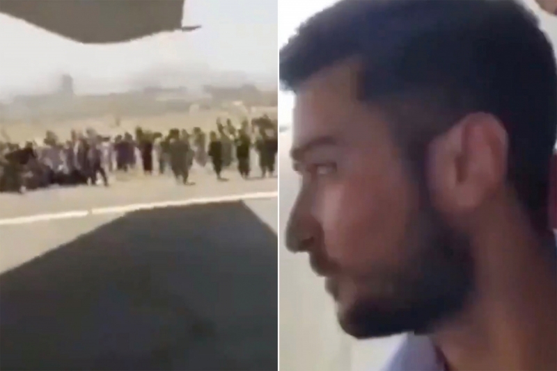 โดยหนุ่มรายหนึ่งเป็นผู้ใช้โทรศัพท์มือถือถ่ายคลิปของตัวเองพร้อมเพื่อนร่วมชะตากรรมอีกจำนวนหนึ่ง ขณะเกาะอยู่ข้างเครื่องบิน C-17 ของกองทัพอากาศสหรัฐอเมริกา ที่กำลังเดินหน้าออกจากสนามบินกรุงคาบูล