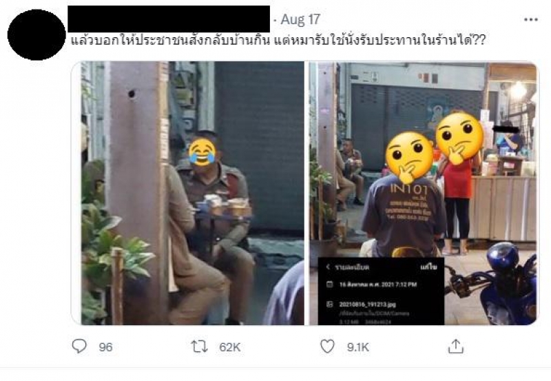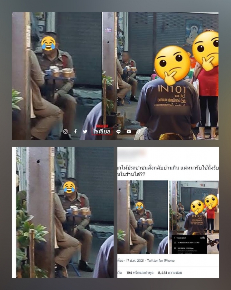 กรณีมีผู้ใช้ทวิตเตอร์รายหนึ่งโพสต์ภาพตำรวจ 2 นาย กำลังนั่งรับประทานอาหารที่ร้านแห่งหนึ่งระบุพื้นที่ย่านเคหะร่มเกล้า เขตลาดกระบัง กทม. พร้อมตั้งคำถามในทำนองว่า ประชาชนให้สั่งกลับบ้าน แต่ตำรวจนั่งกินที่ร้านได้