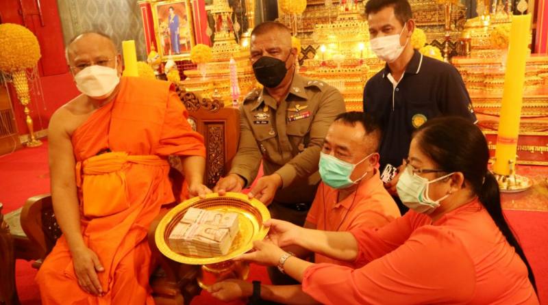 วันที่ 19 ส.ค.64 ที่พระอุโบสถวัดท่าหลวง พระอารามหลวง อ.เมืองพิจิตร ร.ต.อ.วินัย อาสว่าง รอง สว.(ป.) กก.สืบสวน ภ.จว.พิจิตร พร้อมด้วย นางศรีไพร ภรรยาและญาติ นำเงินสด จำนวน 1 ล้านบาท ที่เป็นส่วนหนึ่งที่ได้จากการถูกสลากกินแบ่งรัฐบาล ประจำวันที่ 16 ส.ค. หมายเลข 046750 จำนวน 5 ใบ เป็นรางวัลที่ 1 จำนวน 30 ล้านบาท และได้ไปขึ้นเงินรางวัลที่กองสลากมาเรียบร้อยแล้ว