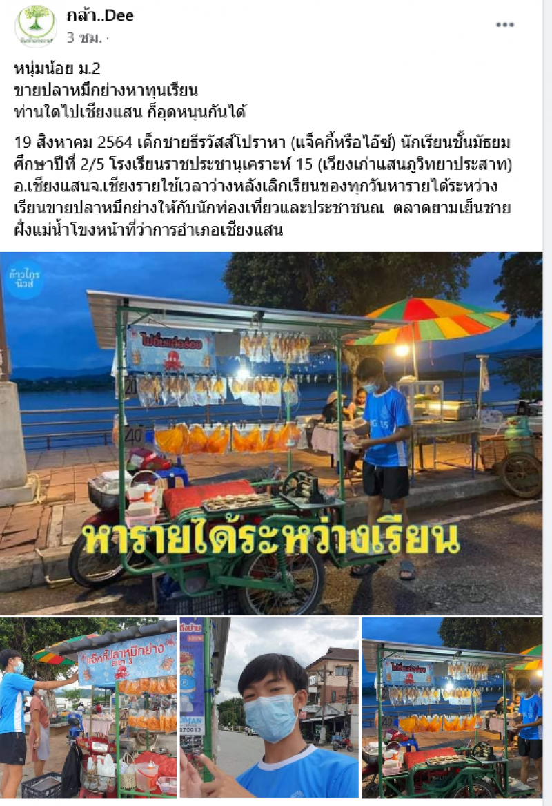 เฟซบุ๊กเพจ กล้า..Dee ได้มีการรายงานเรื่องราวดีๆที่น่าชื่นชมของหนุ่มคนหนึ่ง ที่หารายได้ระัหว่างเรียน โดยระบุว่า หนุ่มน้อย ม.2 ขายปลาหมึกย่างหาทุนเรียน ท่านใดไปเชียงแสน ก็อุดหนุนกันได้ 19 สิงหาคม 2564 เด็กชายธีรวัสส์โปราหา (แจ็คกี้หรือไอ๊ซ์) นักเรียนชั้นมัธยมศึกษาปีที่ 2/5 โรงเรียนราชประชานุเคราะห์ 15 (เวียงเก่าแสนภูวิทยาประสาท) อ.เชียงแสนจ.เชียงรายใช้เวลาว่างหลังเลิกเรียนของทุกวันหารายได้ระหว่างเรียนขายปลาหมึกย่างให้กับนักท่องเที่ยวและประชาชนณ ตลาดยามเย็นชายฝั่งแม่น้ำโขงหน้าที่ว่าการอำเภอเชียงแสน