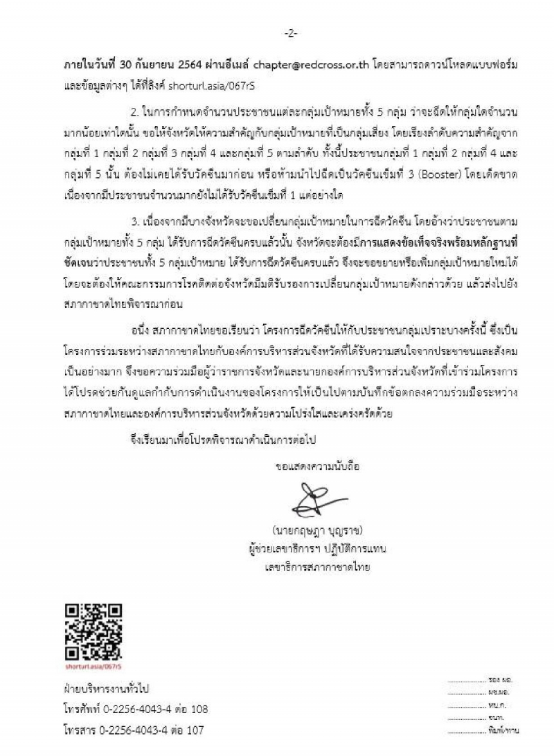 นายกฤษฎา บุญราช ผู้ช่วยเลขาธิการฯ ปฏิบัติการแทนเลขาธิการสภากาชาดไทย ลงนามในหนังสือเรื่อง แนวทางการบริหารวัคซีนป้องกัน cv-19 โมเดอร์นา สภากาชาดไทย ถึงผู้ว่าราชการจังหวัด และนายกองค์การบริหารส่วนจังหวัด 38 จังหวัด โดยมีเนื้อหา ดังนี้