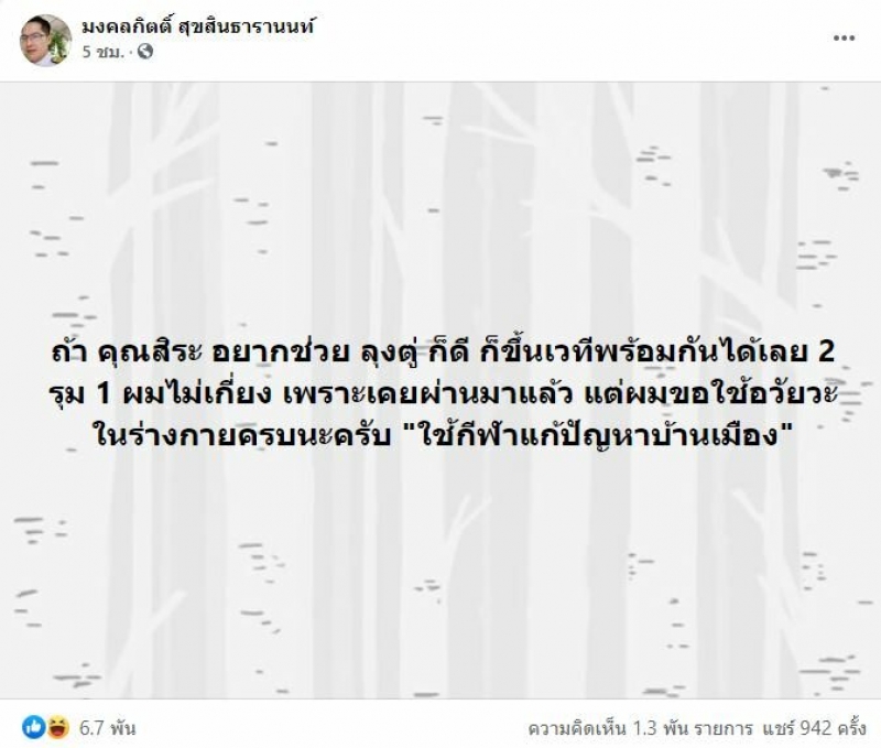 ล่าสุด เต้ มงคลกิตติ์ ออกมาโพสต์อีกครั้งว่า ถ้า คุณสิระ อยากช่วย ลุงตู่ ก็ดี ก็ขึ้นเวทีพร้อมกันได้เลย 2 รุม 1 ผมไม่เกี่ยง เพราะเคยผ่านมาแล้ว แต่ผมขอใช้ อวัยวะ ในร่างกายครบนะครับ ใช้กีฬาแก้ปัญหาบ้านเมือง