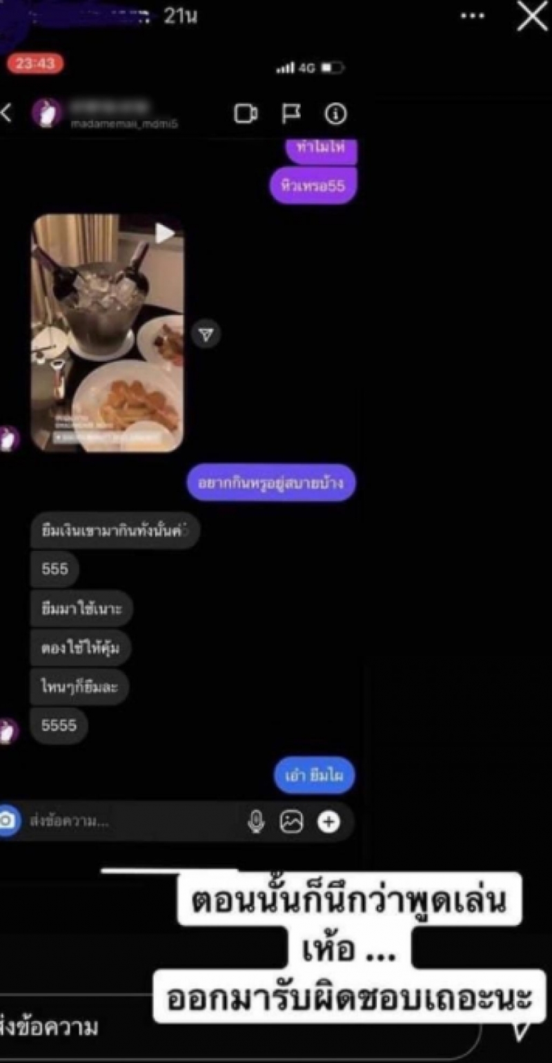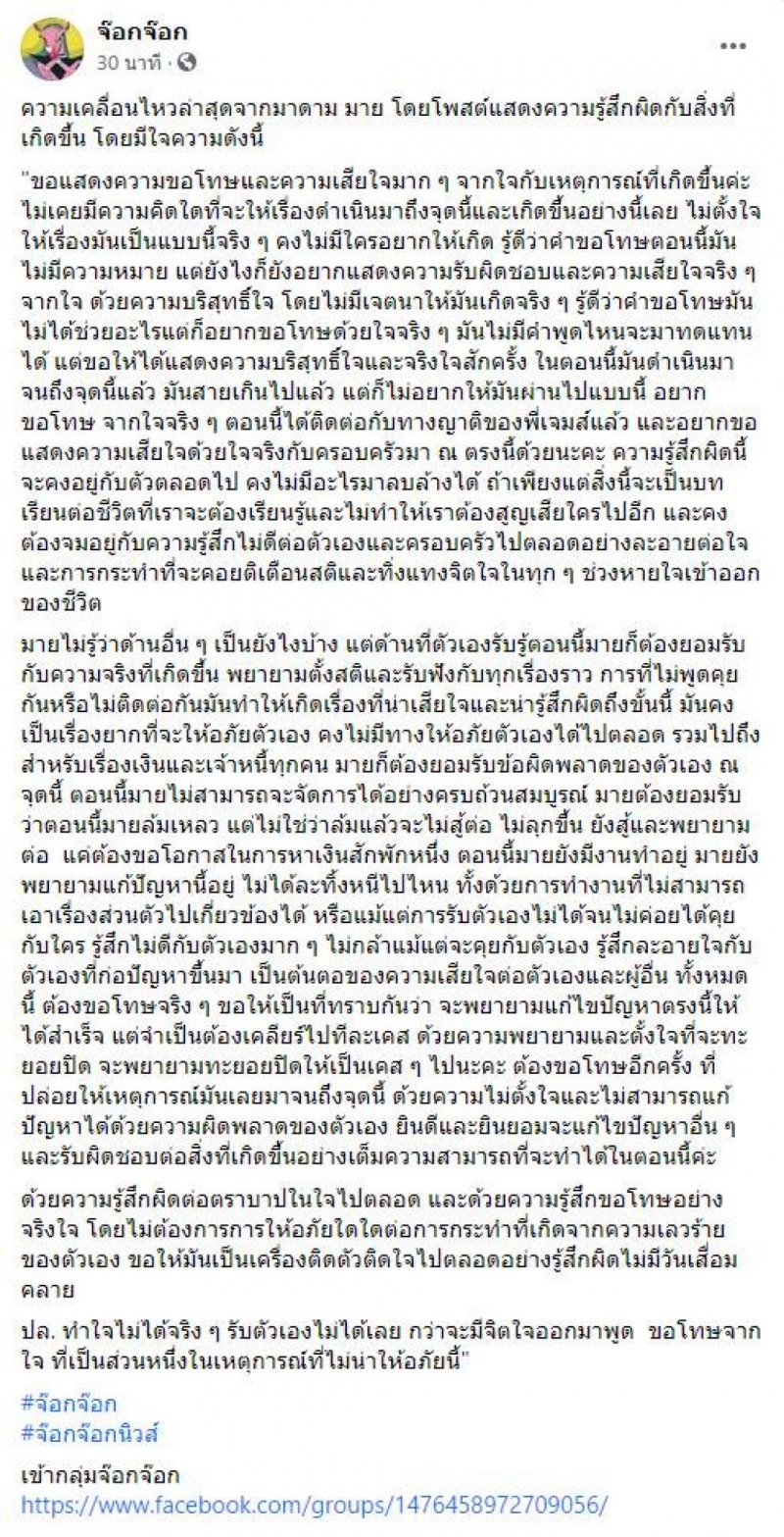ต่อมาเฟซบุ๊กเพจดัง จ๊อกจ๊อก ได้ออกเผยว่า มาดามมาย ได้ออกมาโพสต์ข้อความเปิดเผยความรู้สึกเกี่ยวกับเหตุการณ์ที่เกิดขึ้น