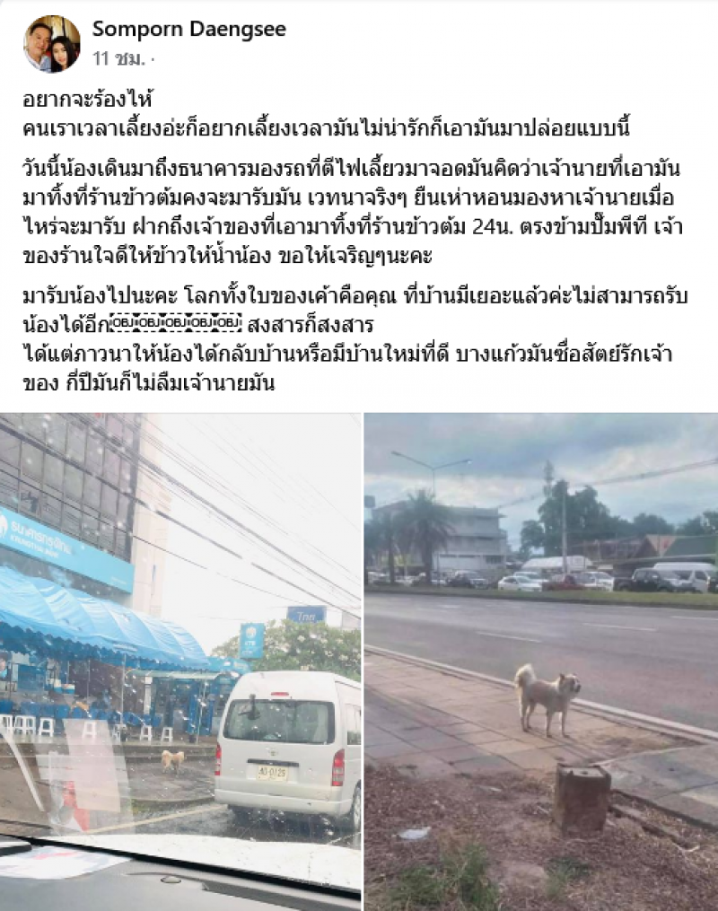 จากกรณี ผู้ใช้เฟซบุ๊กชื่อ Somporn Daengsee ได้โพสต์ภาพสุนัขตัวหนึ่งยืนอยู่หน้าธนาคาร พร้อมระบุข้อความว่า อยากจะร้องไห้คนเราเวลาเลี้ยงอ่ะก็อยากเลี้ยงเวลามันไม่น่ารักก็ เอามันมาปล่อยแบบนี้ วันนี้น้องเดินมาถึงธนาคารมองรถที่ตีไฟเลี้ยวมาจอด มันคิดว่าเจ้านายที่เอามันมาทิ้งที่ร้านข้าวต้มคงจะมารับมัน เวทนาจริงๆ ยืนเห่าหอนมองหาเจ้านาย เมื่อไหร่จะมารับฝากถึงเจ้าของที่เอามาทิ้งที่ร้านข้าวต้ม 24 น. ตรงข้ามปั้มพีที เจ้าของร้านใจดีให้ข้าวให้น้ำน้อง ขอให้เจริญๆนะคะ มารับน้องไปนะคะ โลกทั้งใบของเค้าคือคุณ ที่บ้านมีเยอะแล้วค่ะไม่สามารถรับน้องได้อีก สงสารก็สงสาร ได้แต่ภาวนาให้น้องได้กลับบ้านหรือมีบ้านใหม่ที่ดีบางแก้วมันซื่อสัตย์รักเจ้าของ กี่ปีมันก็ไม่ลืมเจ้านาย