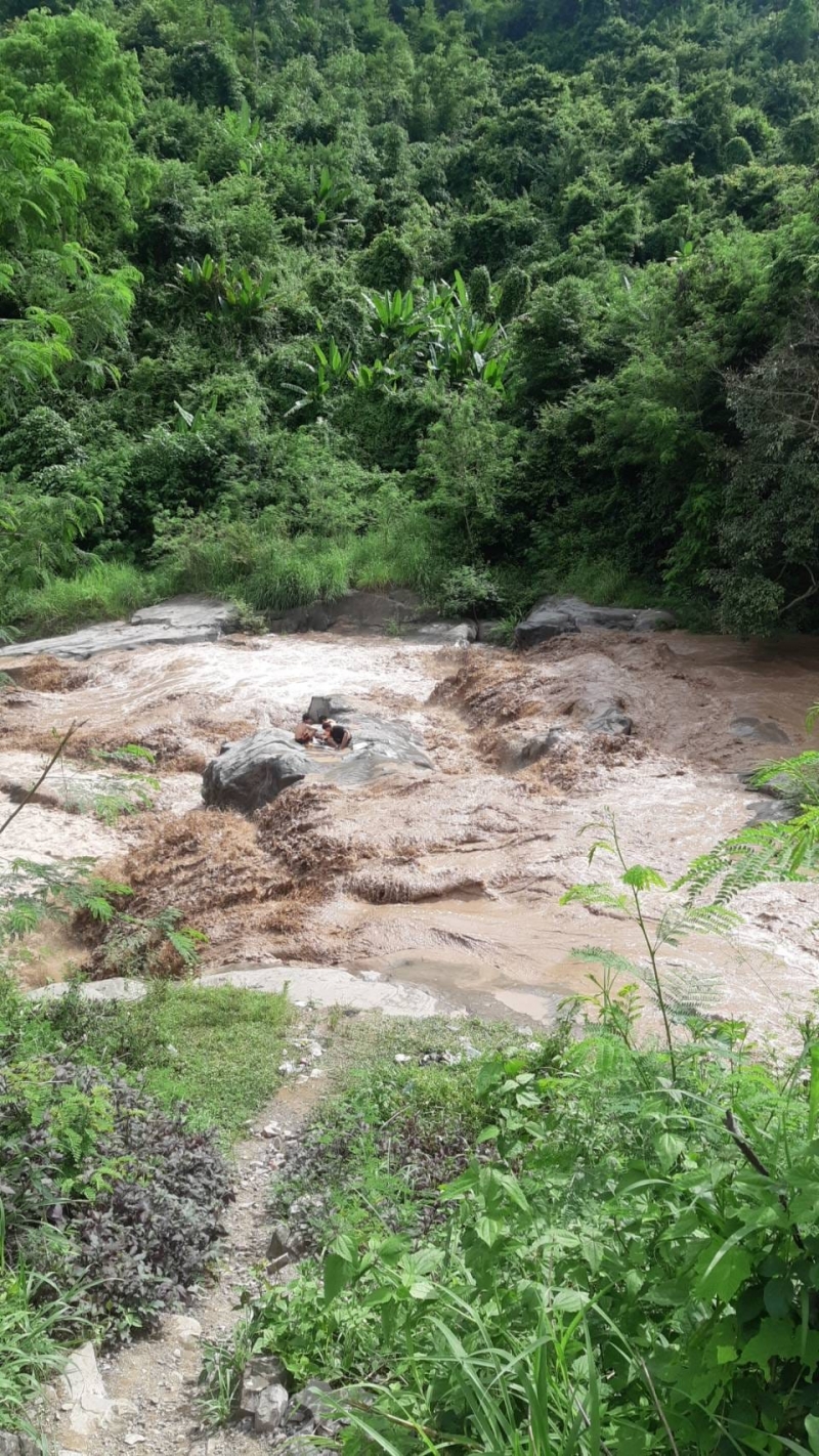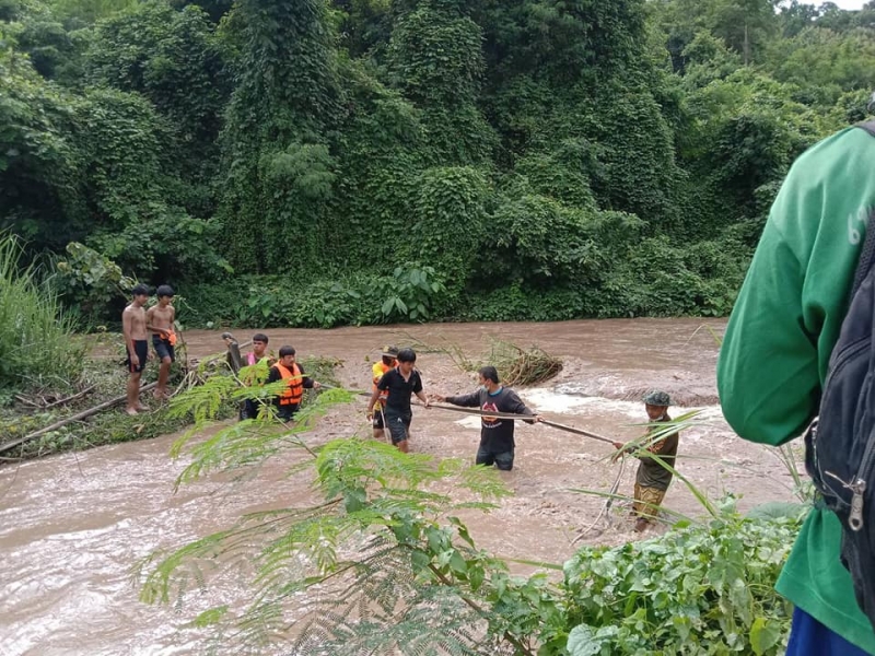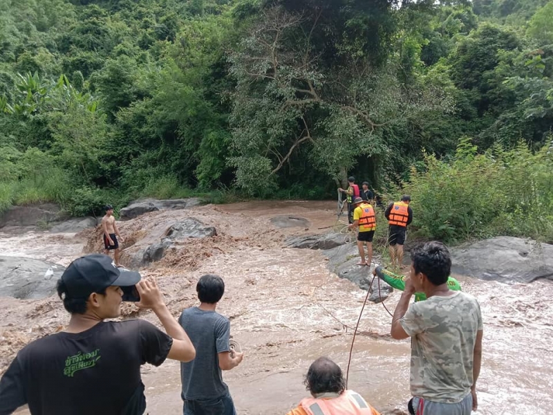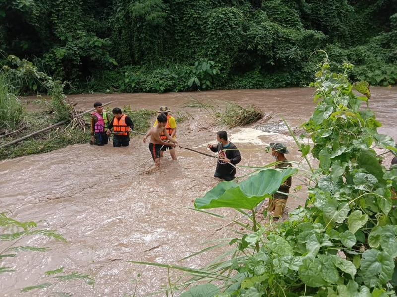 ซึ่งอาสากู้ภัยได้ใช้เชือกมัด แล้วเดินฝ่ากระแสน้ำ โดยที่อีกฝั่งมีเพื่อนคอยให้การช่วยเหลือ หลังเดินข้ามฝ่ากระแสน้ำป่าไปได้ ก็ทำการใช้เชือกผูกกับ ตัว แล้วพาเดินข้ามกระแสน้ำ สุดท้ายก็สามารถให้การช่วยเหลือทั้ง 3 คนได้อย่างปลอดภัย