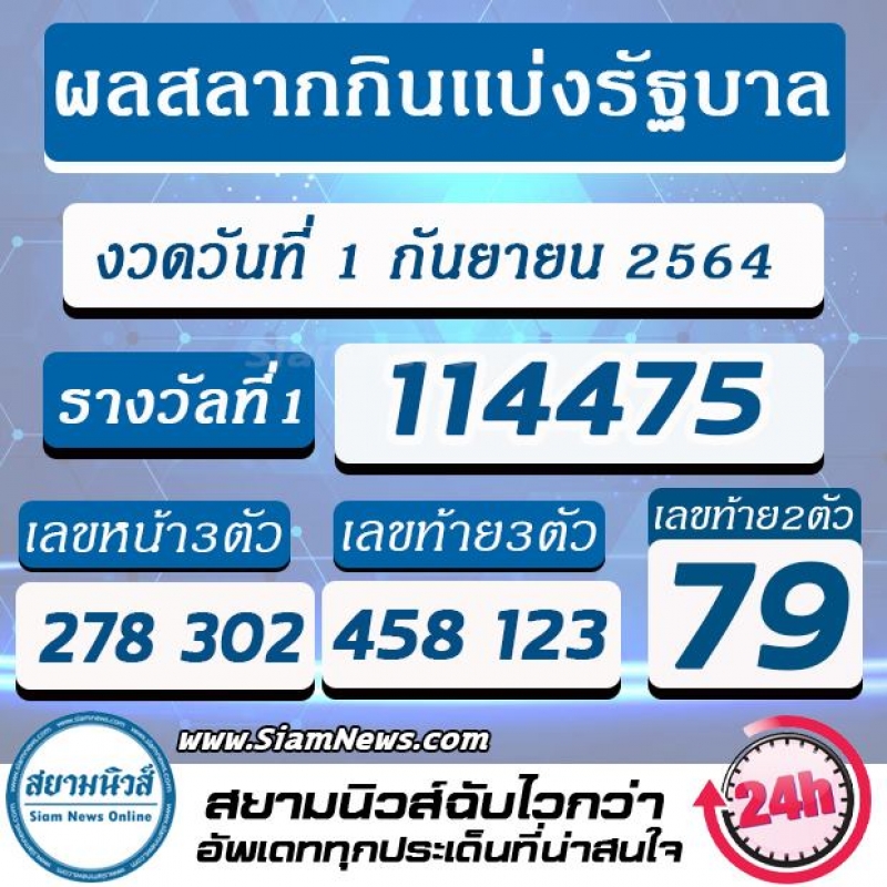 ผ่านไปแล้วสำหรับการประกาศผลสลากกินแบ่งรัฐบาล ประจำวันที่ 1 กันยายน 2564 รางวัลที่ 1 ออกหมายเลข 114475 ส่วนรางวัล เลขหน้า 3 ตัว ออกหมายเลข 302 และ 278 รางวัลเลขท้าย 3 ตัว ออกหมายเลข 123 และ 458 ขณะที่รางวัลเลขท้าย 2 ตัว ออกหมายเลข 79