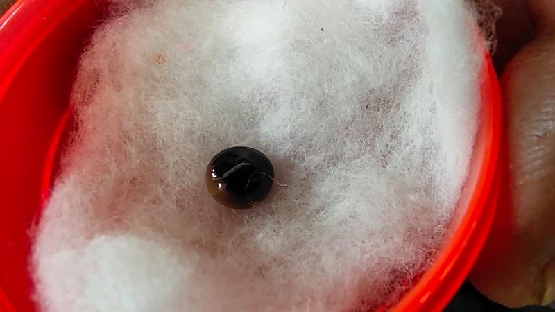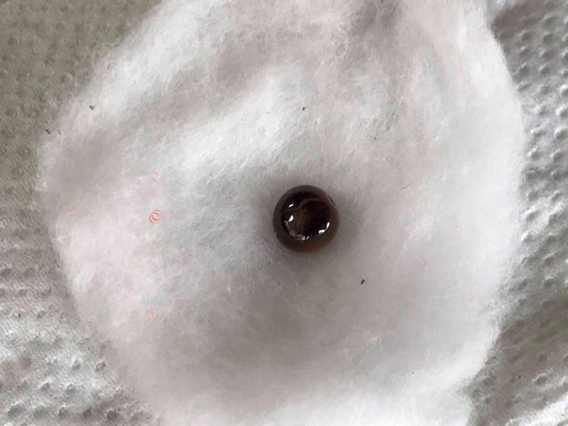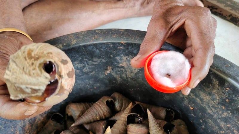 นายโสภณ เล่าให้ฟังอีกว่า ในส่วนของก้อนหิน ประ หลาด เจอในตัวหอยสันขวานนั้น ขณะที่ น้องฝันดี หรือ ด.ญ.อารดา อบรมกลิ่น อายุ 12 ปี ลูกสาวของเพื่อน ได้นำหอยสันขวาน ที่ลวกสุกแล้ว มากินไป 2 ตัว ตัวแรกไม่พบแต่พอตัวที่ 2 เคี้ยวไปแล้ว กำลังจะกลืน ฟันไปเคี้ยวโดน จึงได้คายออกมาดู พบเป็นก้อนหินกลม สีดำสดใส สวยงาม เชื่อว่าเป็นไข่มุก จึงได้เก็บไปให้ร้านจำหน่ายไข่มุก ใกล้บ้านดู